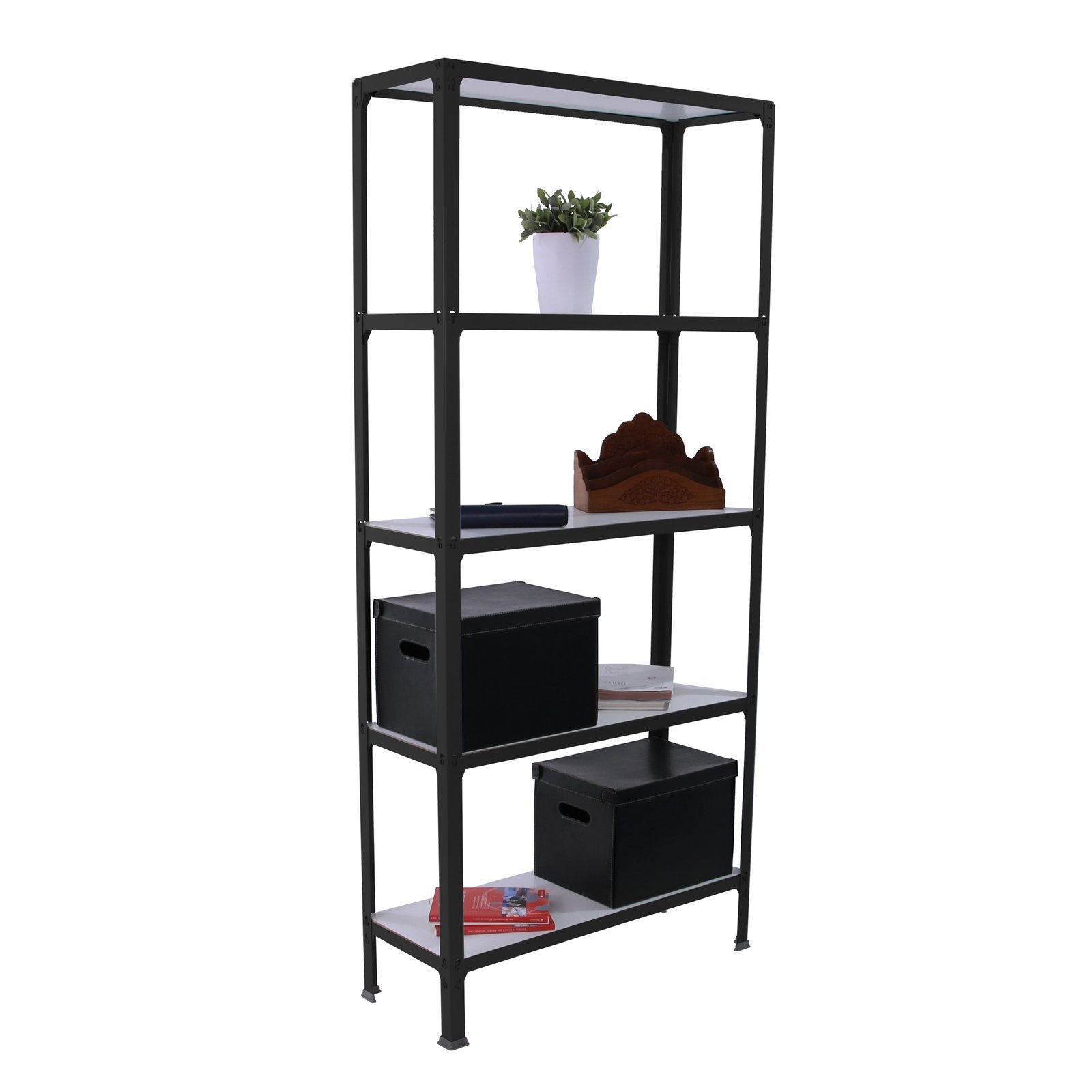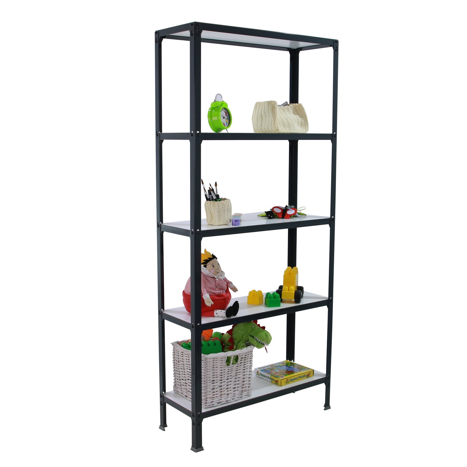 Estanteria metalica sin tornillos ideal para el hogar. Sistema de montaje facil y rapido. Montaje en unos minutos. Color del producto ANTRACITA/BLANCO. Tiene 5 estantes. Las dimensiones de esta estanteria son (alto x ancho x fondo), 1800x800x300 mm. Es rigida y tiene recubrimiento Epoxypoliester antirayaduras e innifugo. No necesita anclaje a la pared. Se pueden ajustar sus estantes en altura y combinarlos como se desee. Estanteria con 4 pies para no rayar el suelo. Capacidad de carga de 150 kgs por estante, certificada a punto de flexion. Packaging con peso ligero. El color antracita es un color muy demandado en decoracion actualmente. Disponible en otros colores. Producto fabricado en Europa por Simonrack