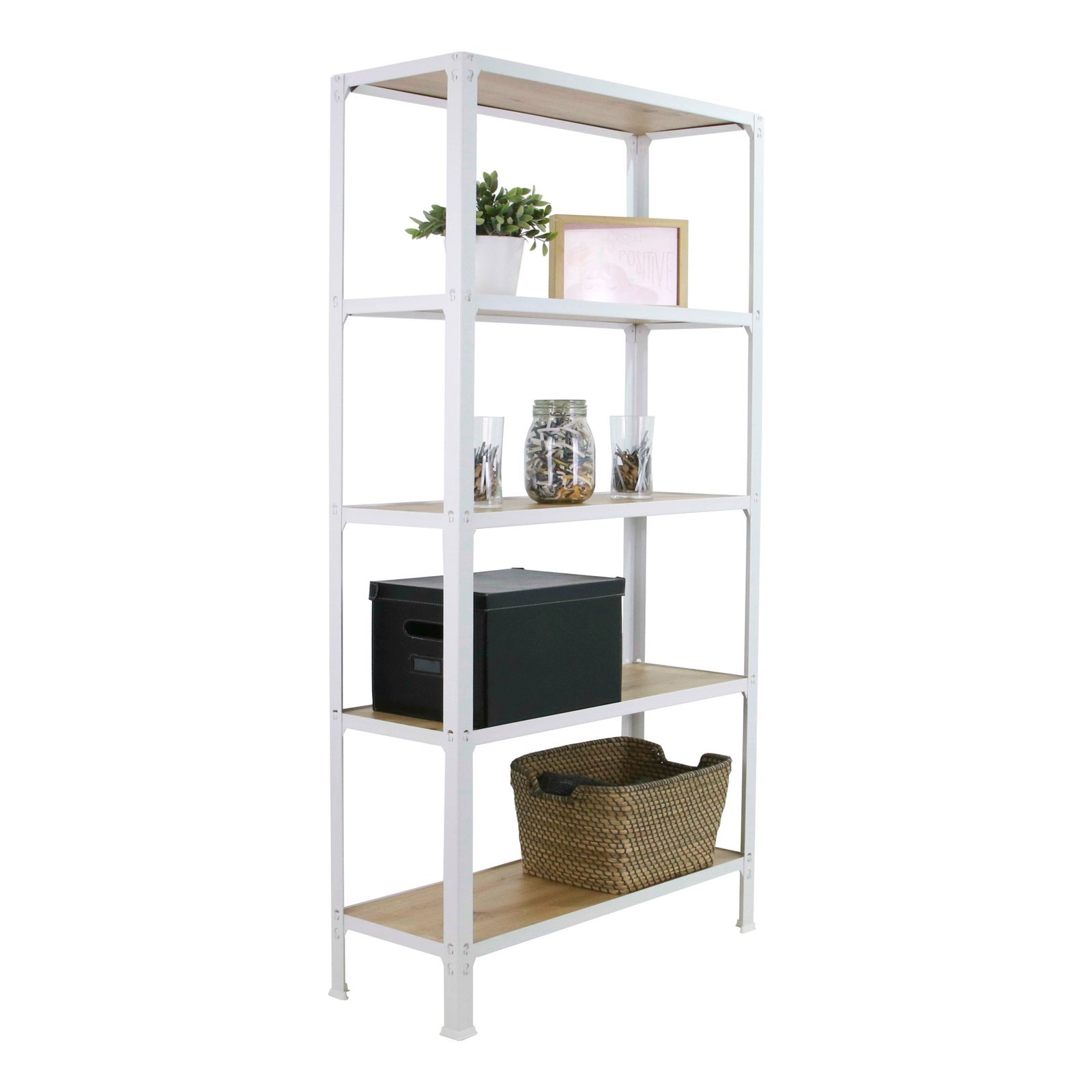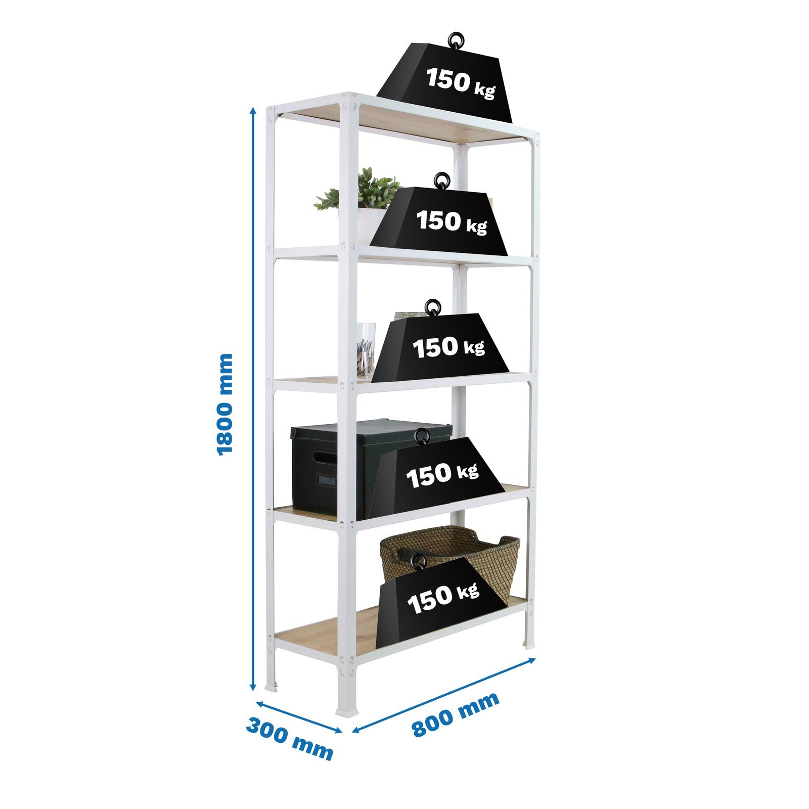 Estanteria metalica sin tornillos de color BLANCO/ROBLE con medidas (alto x ancho x largo) 1800x800x300 mm. Las bandejas son de madera contrachapada de color roble. Tiene 5 estantes y una capacidad de carga por estante de 150 kg. Los estantes tienen altura regulable y las bandejas son faciles de limpiar. fabricado en Europa por Simonrack, calidad europea, puedes encontrar las instrucciones en el interior