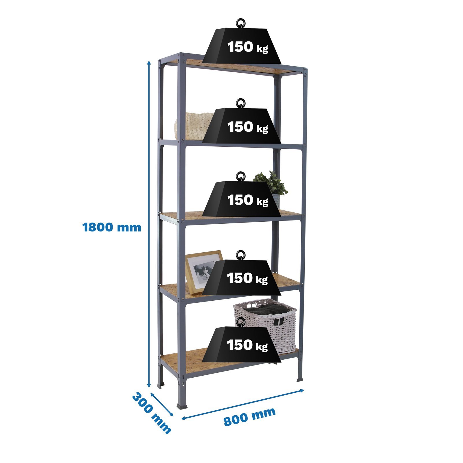 Estanteria metalica sin tornillos y con bandejas de madera OSB, ideal para el hogar. Sistema de montaje facil y rapido. Montaje en unos minutos. Color del producto GRIS/OSB. La bandeja de OSB ofrece una alta resistencia, no tiene nudos, huecos u otros tipos de puntos debiles como pueden tener las bandejas contrachapadas, ademas resiste a la humedad y actua como aislante termico. Tiene 5 estantes. Las dimensiones de esta estanteria son (alto x ancho x fondo), 1800x800x300 mm. Es rigida y tiene recubrimiento Epoxypoliester antirayaduras e innifugo. No necesita anclaje a la pared. Se pueden ajustar sus estantes en altura y combinarlos como se desee. Estanteria con 4 pies para no rayar el suelo. Capacidad de carga de 150 kgs por estante, certificada a punto de flexion. Packaging con peso ligero. Disponible en otros colores. Producto fabricado en Europa por Simonrack