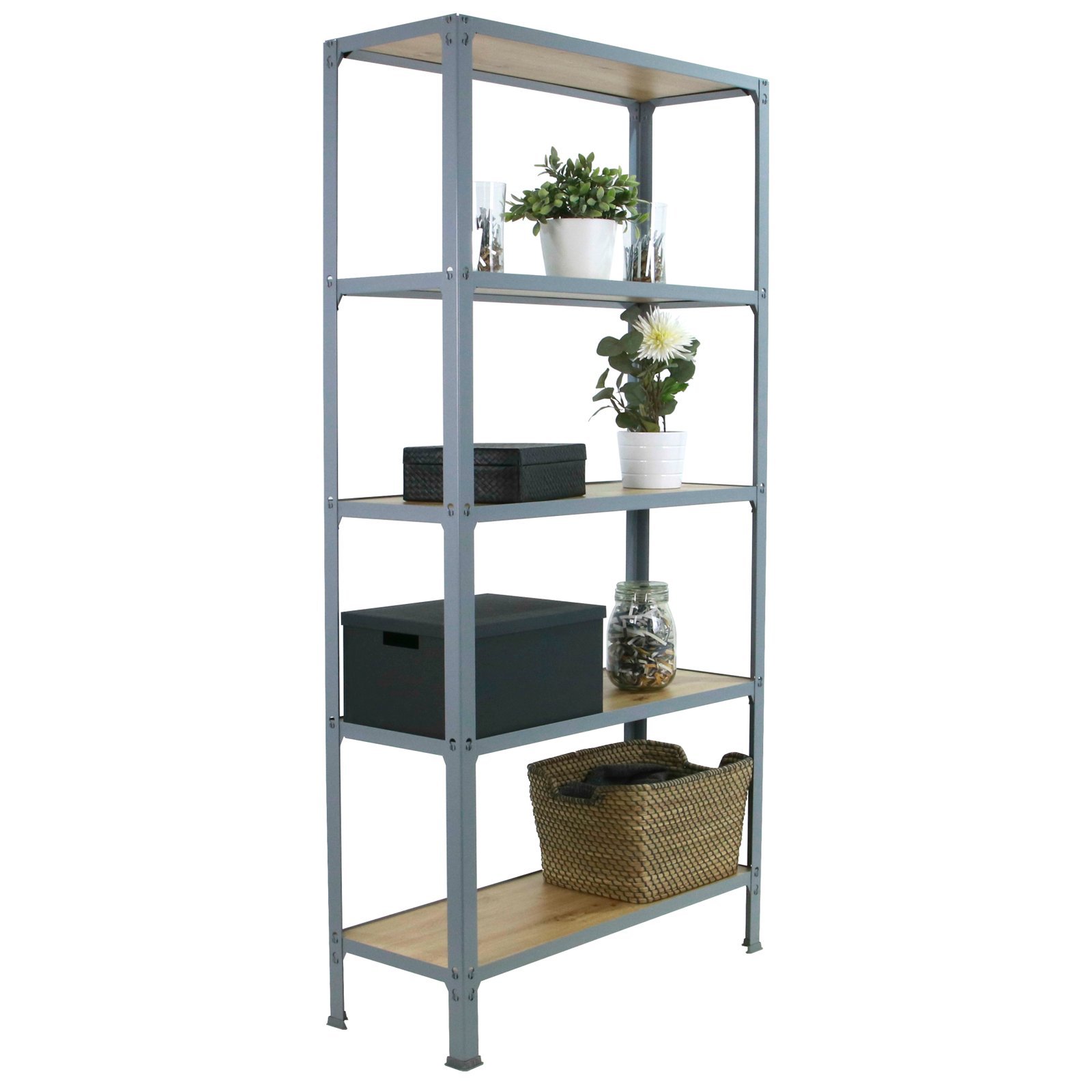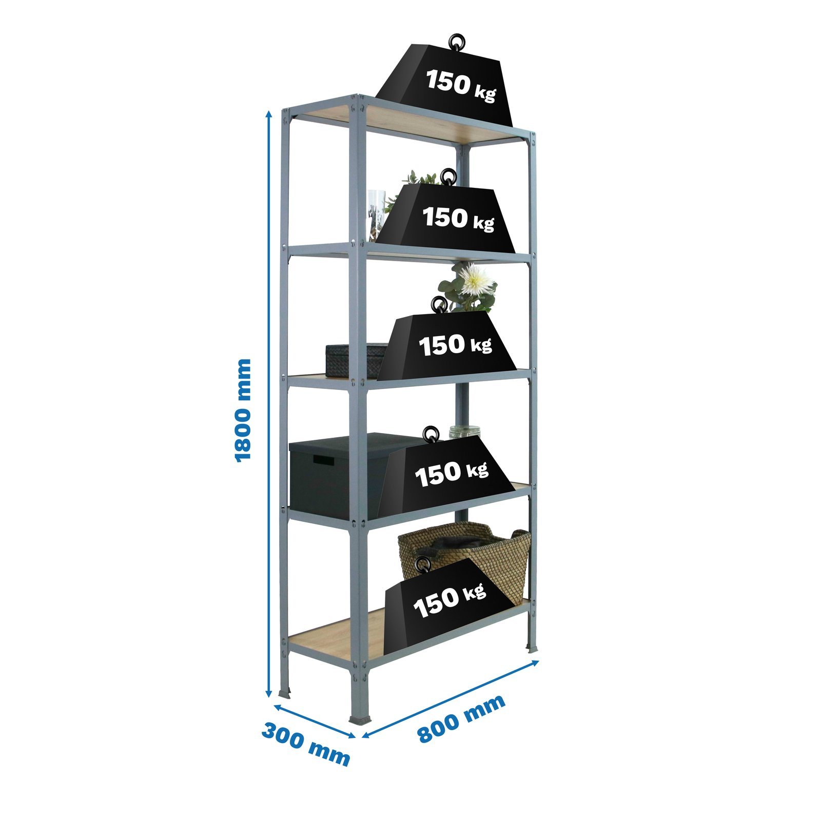 Estanteria metalica sin tornillos de color GRIS/ROBLE con medidas (alto x ancho x largo) 1800x800x300 mm. Las bandejas son de madera contrachapada de color roble. Tiene 5 estantes y una capacidad de carga por estante de 150 kg. Los estantes tienen altura regulable y las bandejas son faciles de limpiar. fabricado en Europa por Simonrack, calidad europea, puedes encontrar las instrucciones en el interior