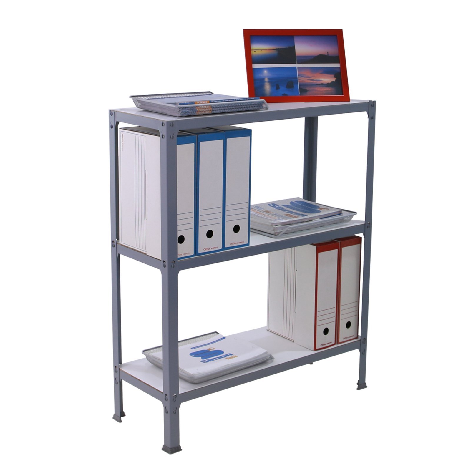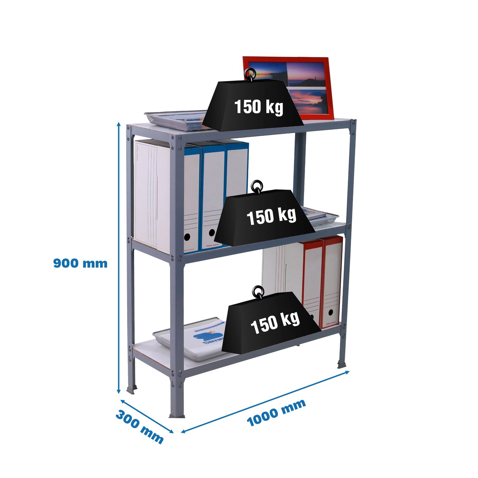 Estanteria metalica de color gris/blanco con 3 estantes. Tiene una capacidad de carga por estante de 150 kg y una capacidad total de 450 kgs. Con unas medidas en mm de 900x1000x300. Es rigida. No necesita anclaje a la pared. estanterias sin tornillos. La manera mas facil y rapida de montaje. estanterias con topes para no rayar el sueloFabricada en Europa por Simonrack y se monta rapido siguiendo las instrucciones