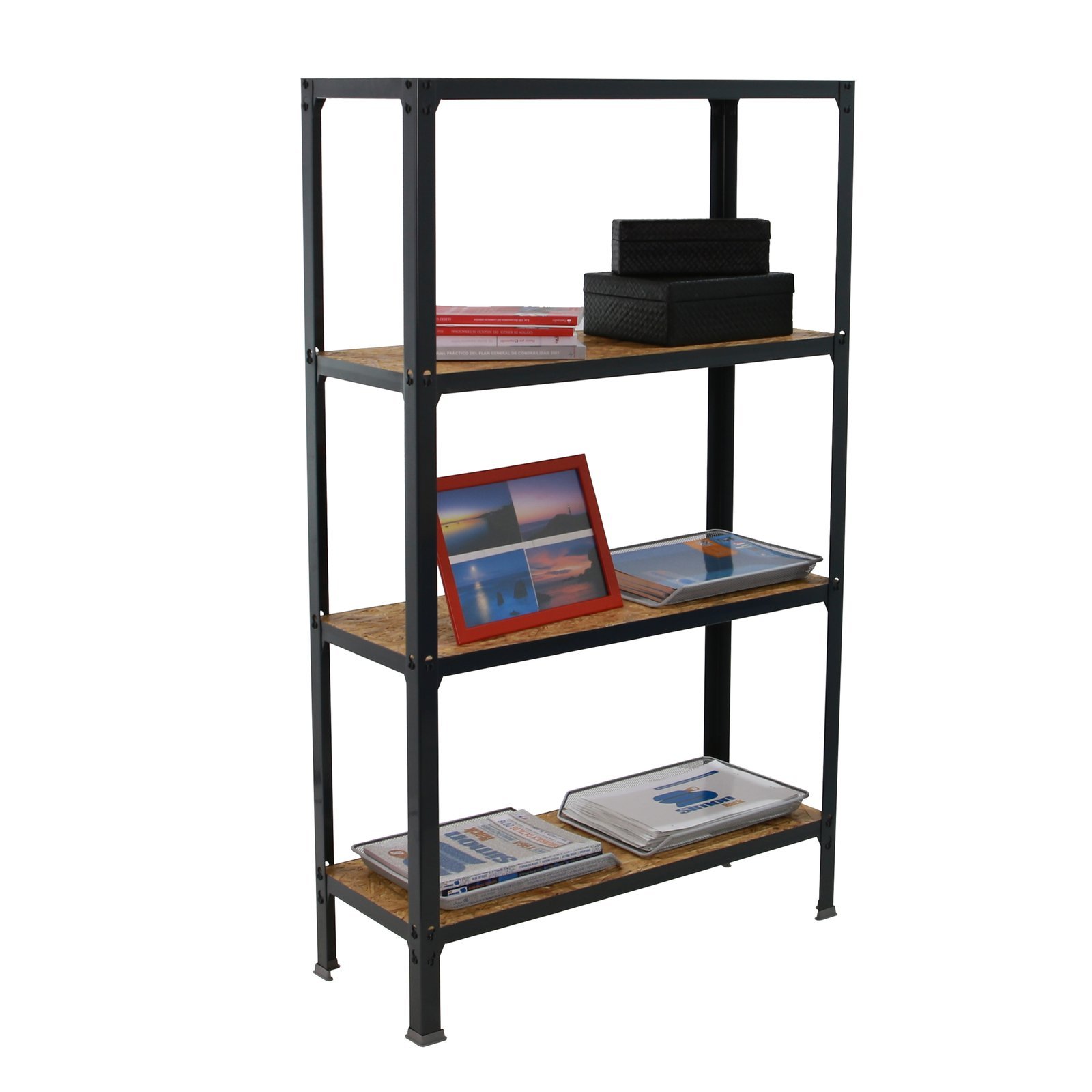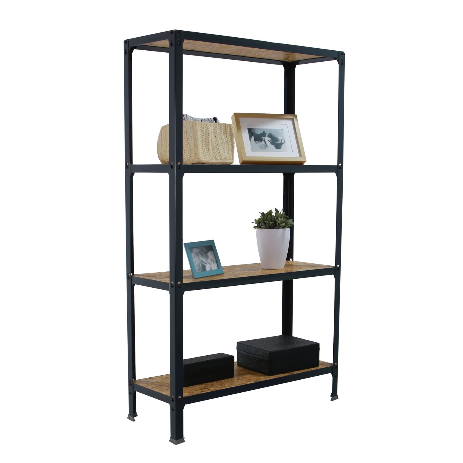 Estanteria metalica sin tornillos y con bandejas de madera OSB, ideal para el hogar. Sistema de montaje facil y rapido. Montaje en unos minutos. Color del producto ANTRACITA/OSB. La bandeja de OSB ofrece una alta resistencia, no tiene nudos, huecos u otros tipos de puntos debiles como pueden tener las bandejas contrachapadas, ademas resiste a la humedad y actua como aislante termico. Tiene 4 estantes. Las dimensiones de esta estanteria son (alto x ancho x fondo), 1600x1000x300 mm. Es rigida y tiene recubrimiento Epoxypoliester antirayaduras e innifugo. No necesita anclaje a la pared. Se pueden ajustar sus estantes en altura y combinarlos como se desee. Estanteria con 4 pies para no rayar el suelo. Capacidad de carga de 150 kgs por estante, certificada a punto de flexion. Packaging con peso ligero. Disponible en otros colores. Producto fabricado en Europa por Simonrack