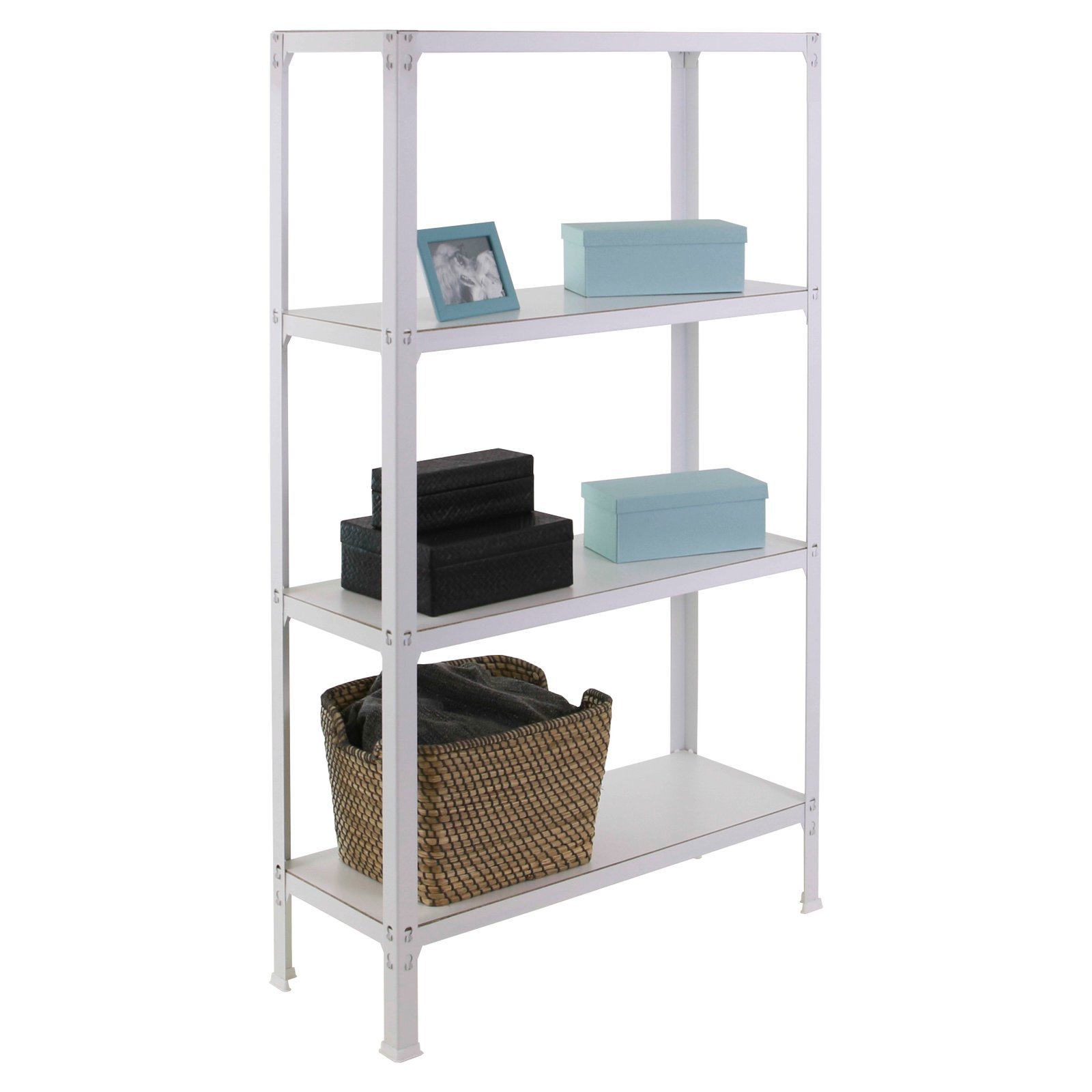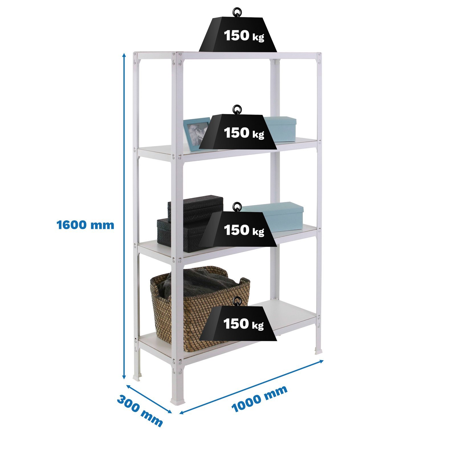 Estanteria metalica de color blanco/blanco con 4 estantes. Tiene una capacidad de carga por estante de 150 kg y una capacidad total de 600 kgs. Con unas medidas en mm de 1600x1000x300. Es rigida. No necesita anclaje a la pared. estanterias sin tornillos. La manera mas facil y rapida de montaje. estanterias con topes para no rayar el sueloFabricada en Europa por Simonrack y se monta rapido siguiendo las instrucciones