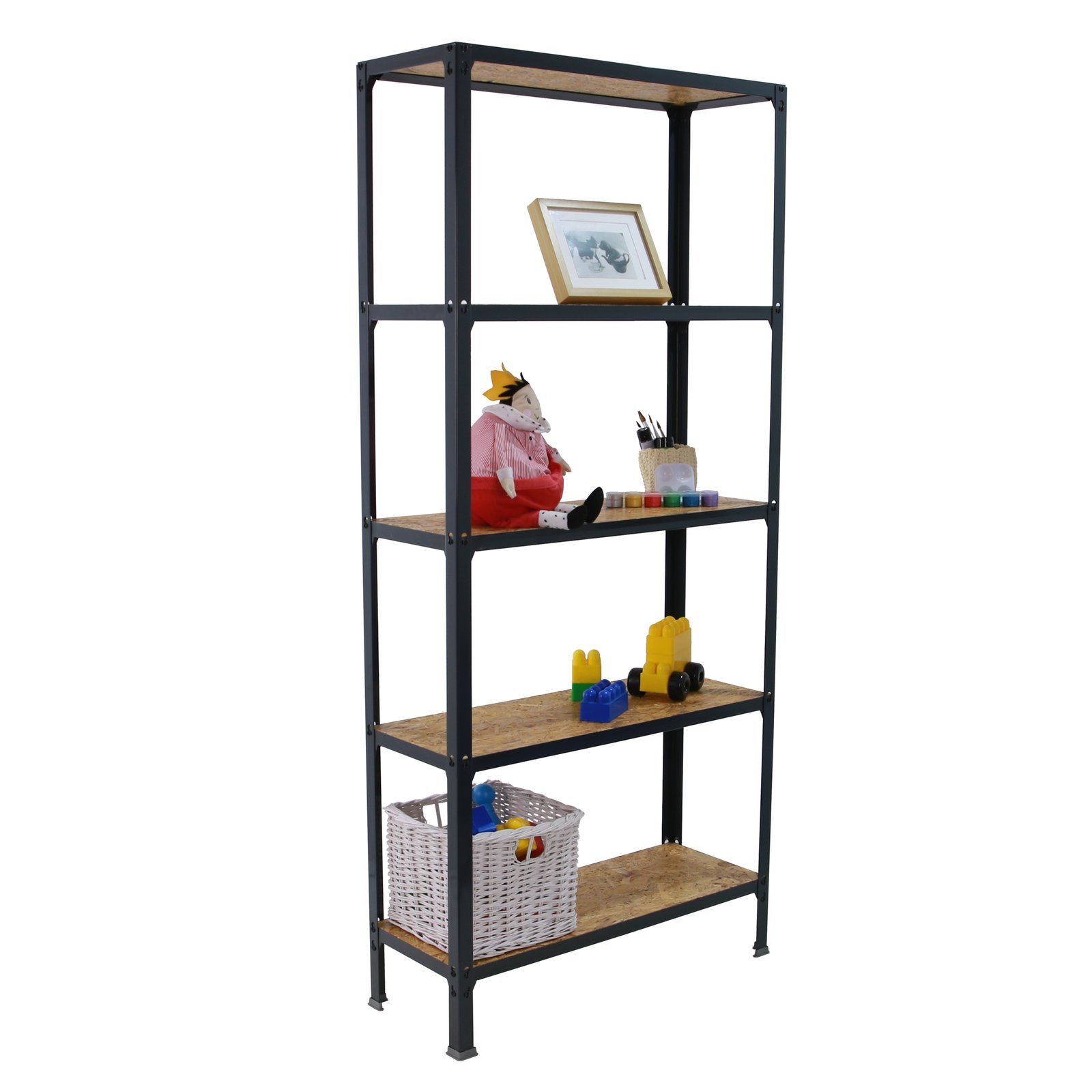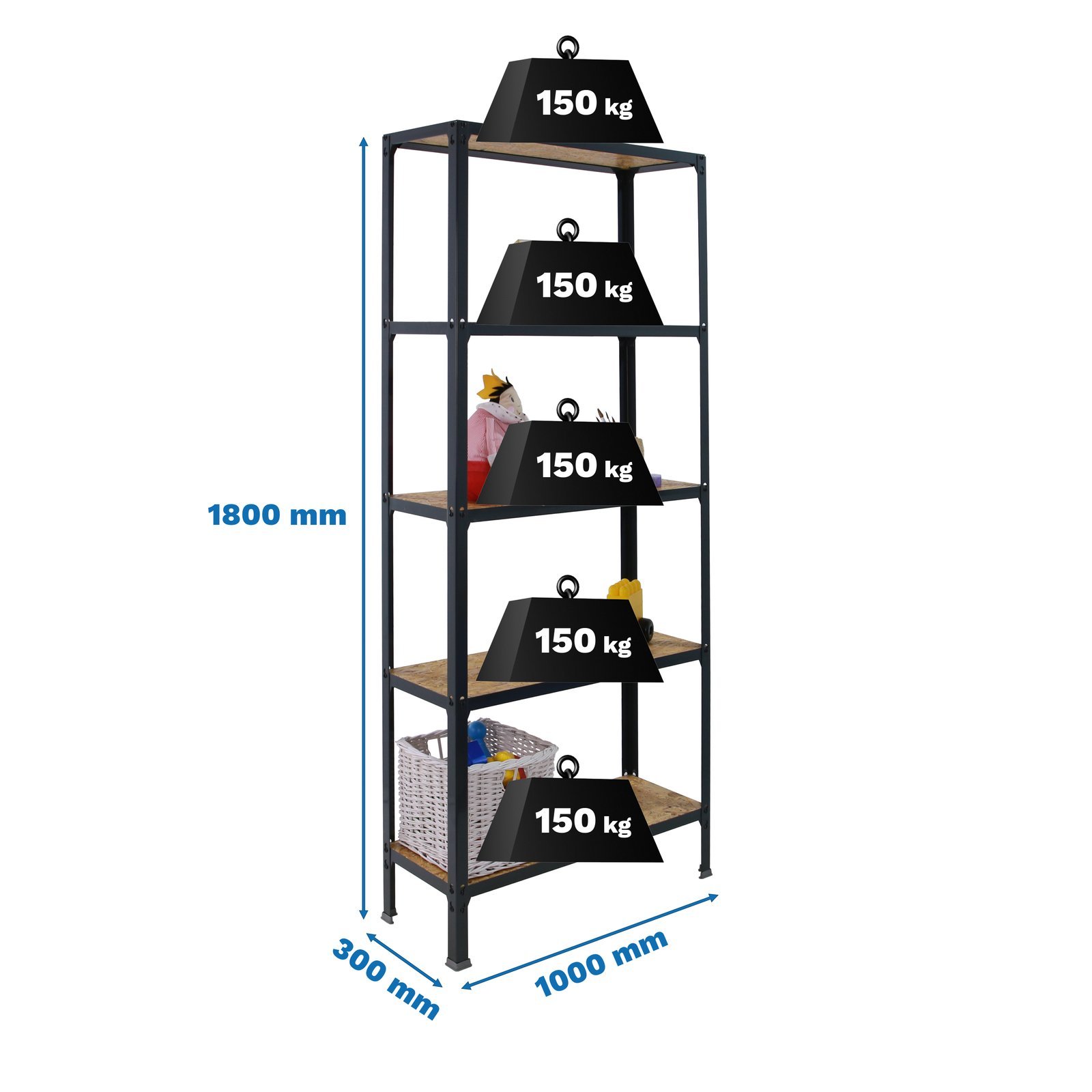 Estanteria metalica sin tornillos y con bandejas de madera OSB, ideal para el hogar. Sistema de montaje facil y rapido. Montaje en unos minutos. Color del producto ANTRACITA/OSB. La bandeja de OSB ofrece una alta resistencia, no tiene nudos, huecos u otros tipos de puntos debiles como pueden tener las bandejas contrachapadas, ademas resiste a la humedad y actua como aislante termico. Tiene 5 estantes. Las dimensiones de esta estanteria son (alto x ancho x fondo), 1800x1000x300 mm. Es rigida y tiene recubrimiento Epoxypoliester antirayaduras e innifugo. No necesita anclaje a la pared. Se pueden ajustar sus estantes en altura y combinarlos como se desee. Estanteria con 4 pies para no rayar el suelo. Capacidad de carga de 150 kgs por estante, certificada a punto de flexion. Packaging con peso ligero. El antracita es un color muy demandado en decoracion actualmente. Disponible en otros colores. Producto fabricado en Europa por Simonrack