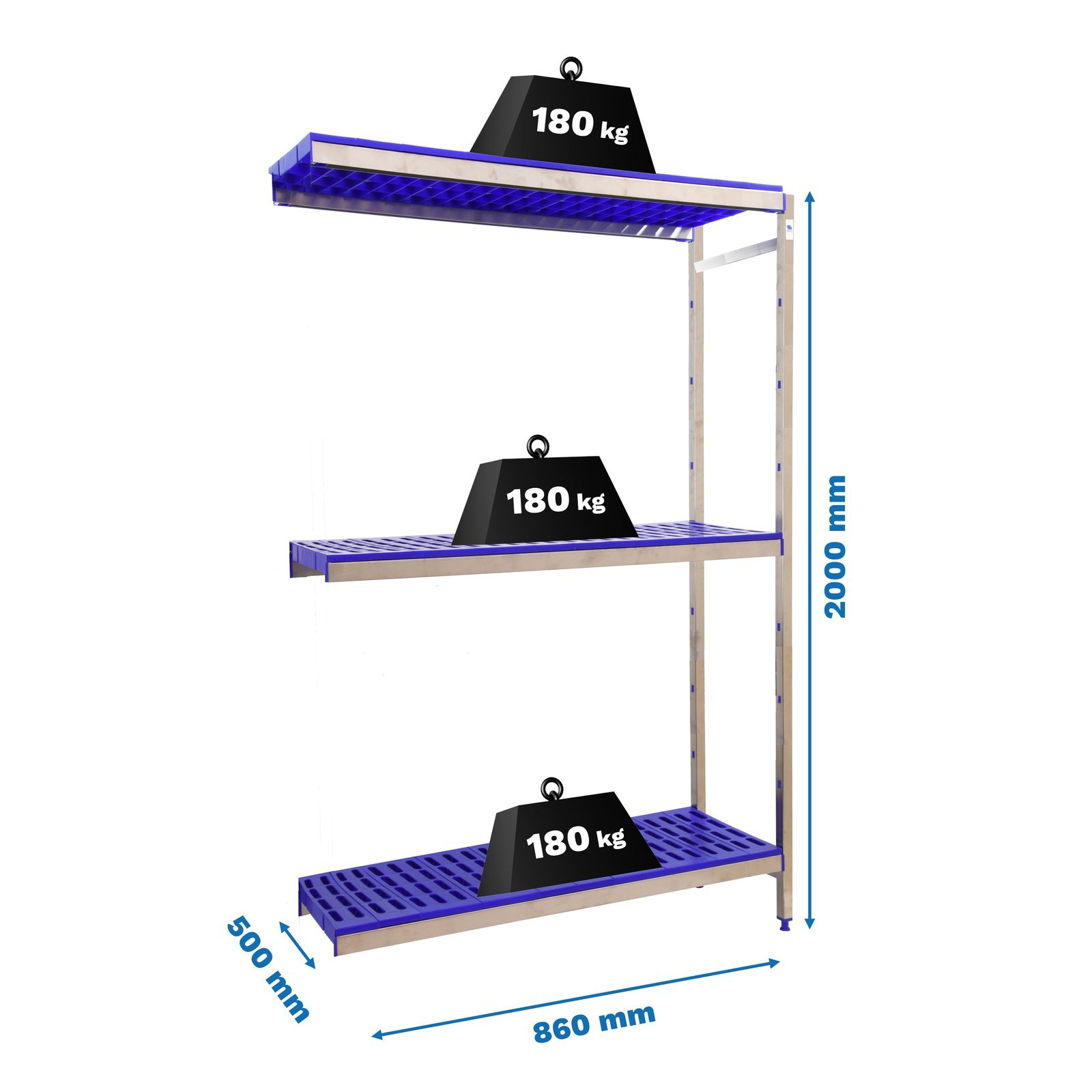 Estanteria adicional de acero inoxidable y bandejas de polipropileno que aguanta hasta 30 bajo cero y es perfecta para la organizacion y manipulacion de alimentos. El modulo adicional necesita uno inicial para completar su instalacion. Esta estanteria tiene 3 estantes y sus bandejas tienen una capacidad de carga de 180 kgs cada una. El montaje es muy sencillo y rapido con su sistema sin tornillos y tiene unas dimensiones de 2000x860x500 mms