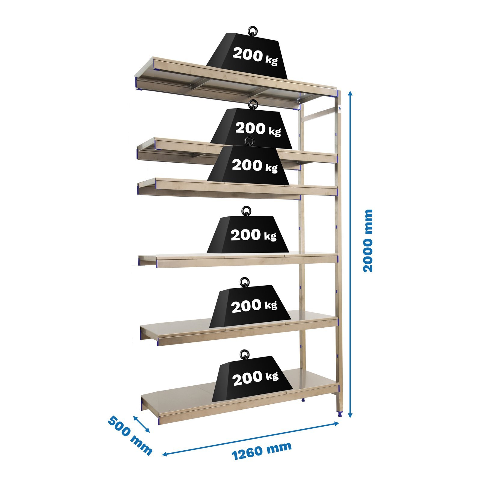 Estanteria adicional de acero inoxidable que aguanta hasta 30 bajo cero y es perfecta para la organizacion y manipulacion de alimentos. El modulo adicional necesita a adirse a un modulo inicial para completar su instalacion. Esta estanteria tiene 6 estantes y sus bandejas tienen una capacidad de carga de 200 kgs cada una. El montaje es muy sencillo y rapido con su sistema sin tornillos y tiene unas dimensiones de 2000x1260x500 mms