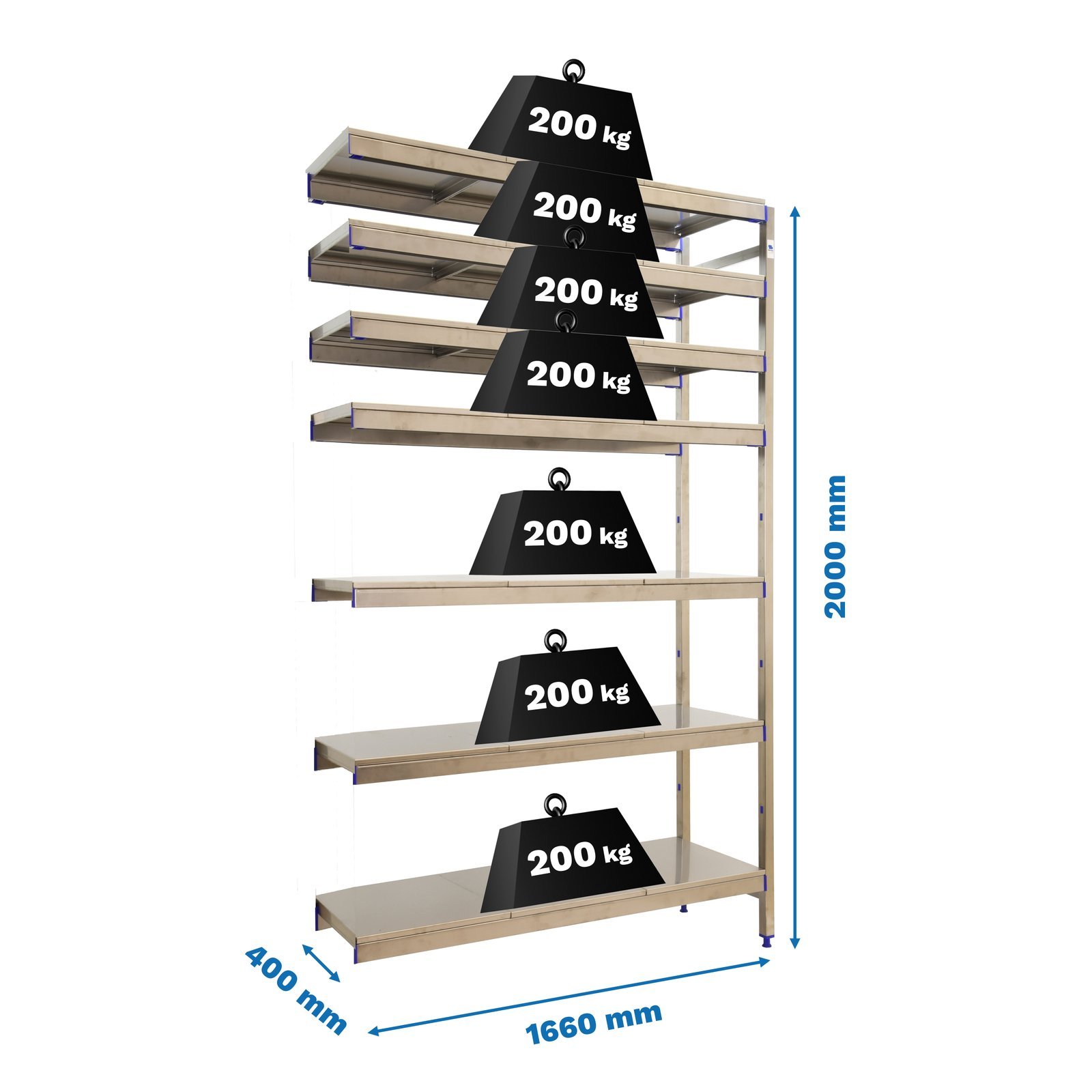 Estanteria adicional de acero inoxidable que aguanta hasta 30 bajo cero y es perfecta para la organizacion y manipulacion de alimentos. El modulo adicional necesita a adirse a un modulo inicial para completar su instalacion. Esta estanteria tiene 7 estantes y sus bandejas tienen una capacidad de carga de 200 kgs cada una. El montaje es muy sencillo y rapido con su sistema sin tornillos y tiene unas dimensiones de 2000x1660x400 mms
