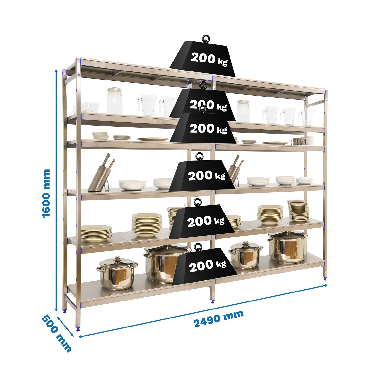 Estanteria metalica sin tornillos de color ACERO INOXIDABLE con capacidad de carga por estante de 200 kg. El numero de estantes es 6 y las medidas (alto x ancho x fondo) son 1600x2490x500 mm. Hecha de acero inoxidable y con la capacidad de aguantar hasta 30 grados bajo cero. modulo inicial. Producto europeo, calidad europea, podras encontrar las instrucciones de montaje en su interior. Medidas en uso del producto, 1600x2490x500 mm