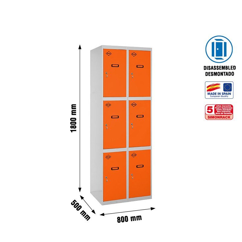 Taquilla metalica de 2 cuerpos de color gris y 6 puertas de color naranja. Las dimensiones son 1800x800x500 mm. Se entrega desmontada. Modulo inicial. Permite asociar varias adicionales. Se monta de forma facil siguiendo las instrucciones. Producto fabricado en Europa por Simonrack. No contiene aristas de corte y no necesita anclaje a la pared. No se tambalea. Contiene llaves y cerraduras