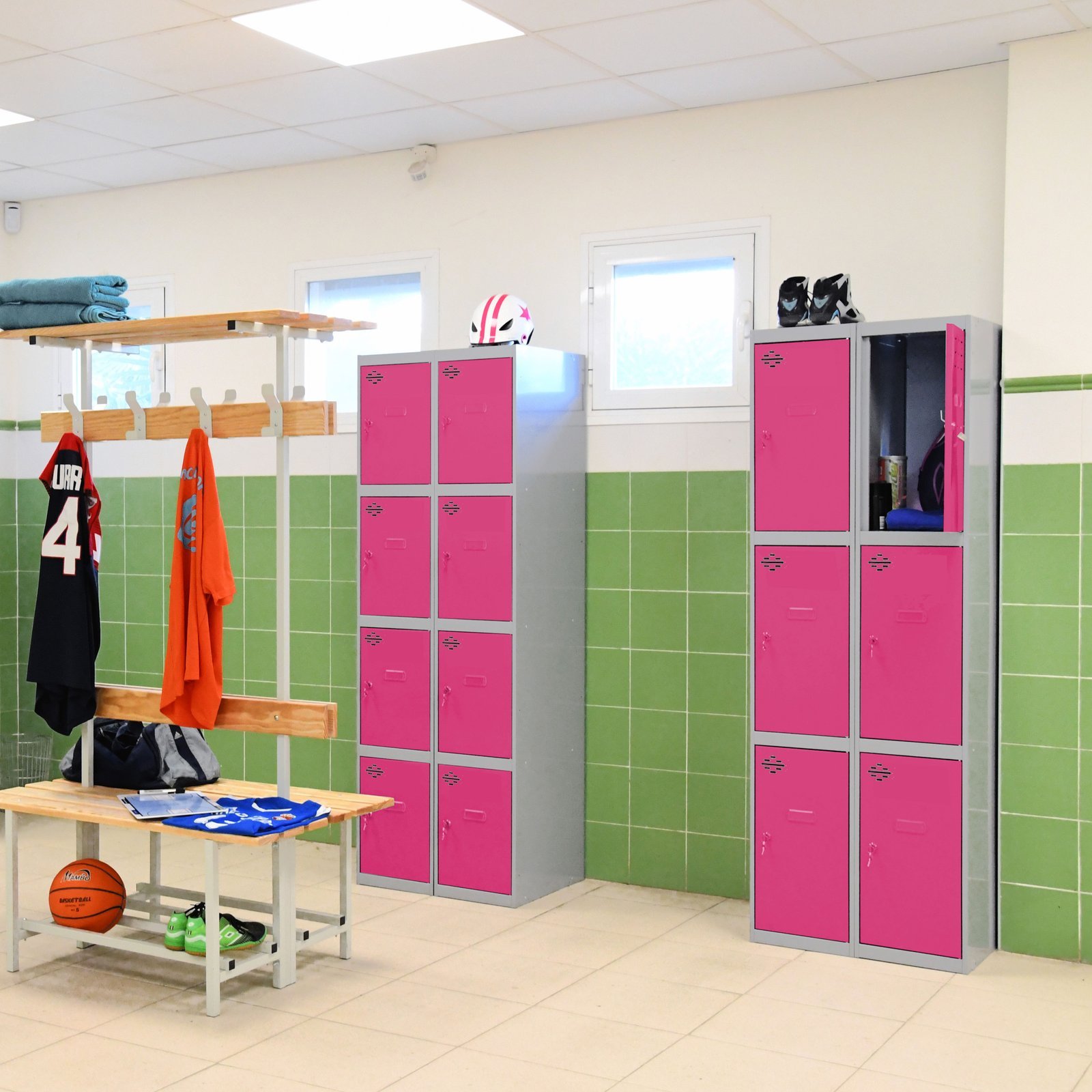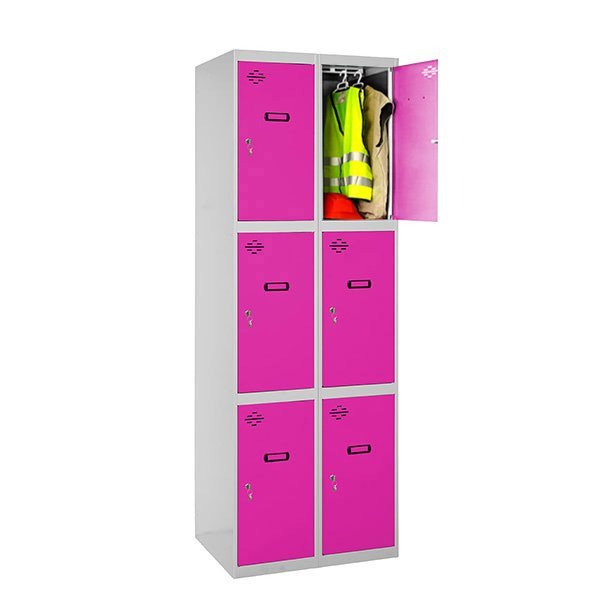 Taquilla metalica de 2 cuerpos de color gris y 6 puertas de color rosa. Las dimensiones son 1800x800x500 mm. Se entrega desmontada. Modulo inicial. Permite asociar varias adicionales. Se monta de forma facil siguiendo las instrucciones. Producto fabricado en Europa por Simonrack. No contiene aristas de corte y no necesita anclaje a la pared. No se tambalea. Contiene llaves y cerraduras