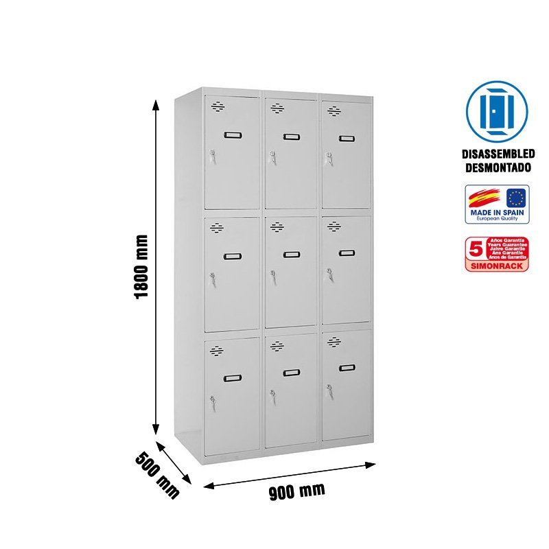 Taquilla resistente y estable con 3 puertas y 3 cuerpos. Con 9 departamentos. Incluye cerradura y respiraderos para mejor transpiracion interior. Permite asociar varias adicionales. Se entrega desmontado. No necesita anclaje a la pared. Color del producto GRIS. Dimensiones 1800x900x500 mm