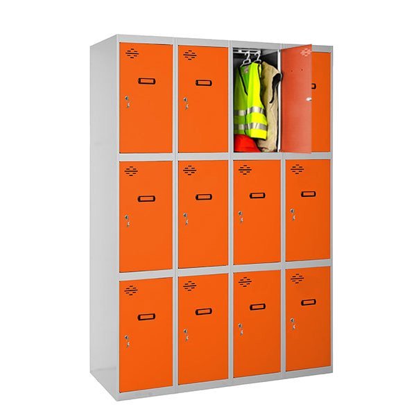 Taquilla metalica de color GRIS/NARANJA con medidas, (alto x ancho x largo) 1800x1200x500 mm. Se entrega desmontada. Tiene 4 cuerpos y 12 puertas. Incluye cerradura, llaves y etiquetero para colocar nombre. Hecho en Europa, calidad europea