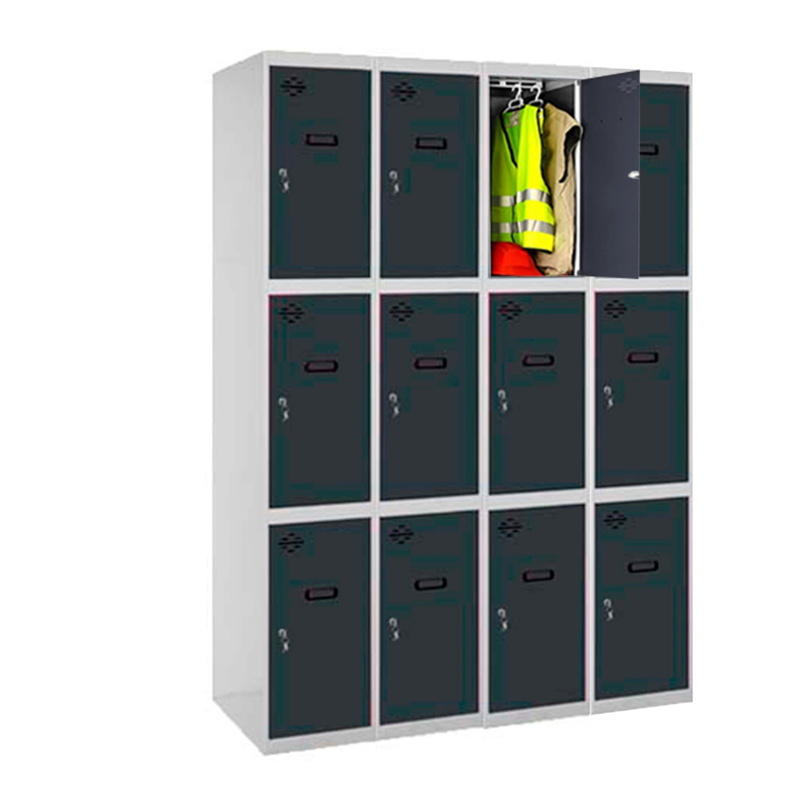 Taquilla metalica de 4 cuerpos de color gris y 12 puertas de color antracita. Las dimensiones son 1800x1600x500 mm. Se entrega desmontada. Modulo inicial. Permite asociar varias adicionales. Se monta de forma facil siguiendo las instrucciones. Producto fabricado en Europa por Simonrack. No contiene aristas de corte y no necesita anclaje a la pared. No se tambalea. Contiene llaves y cerraduras