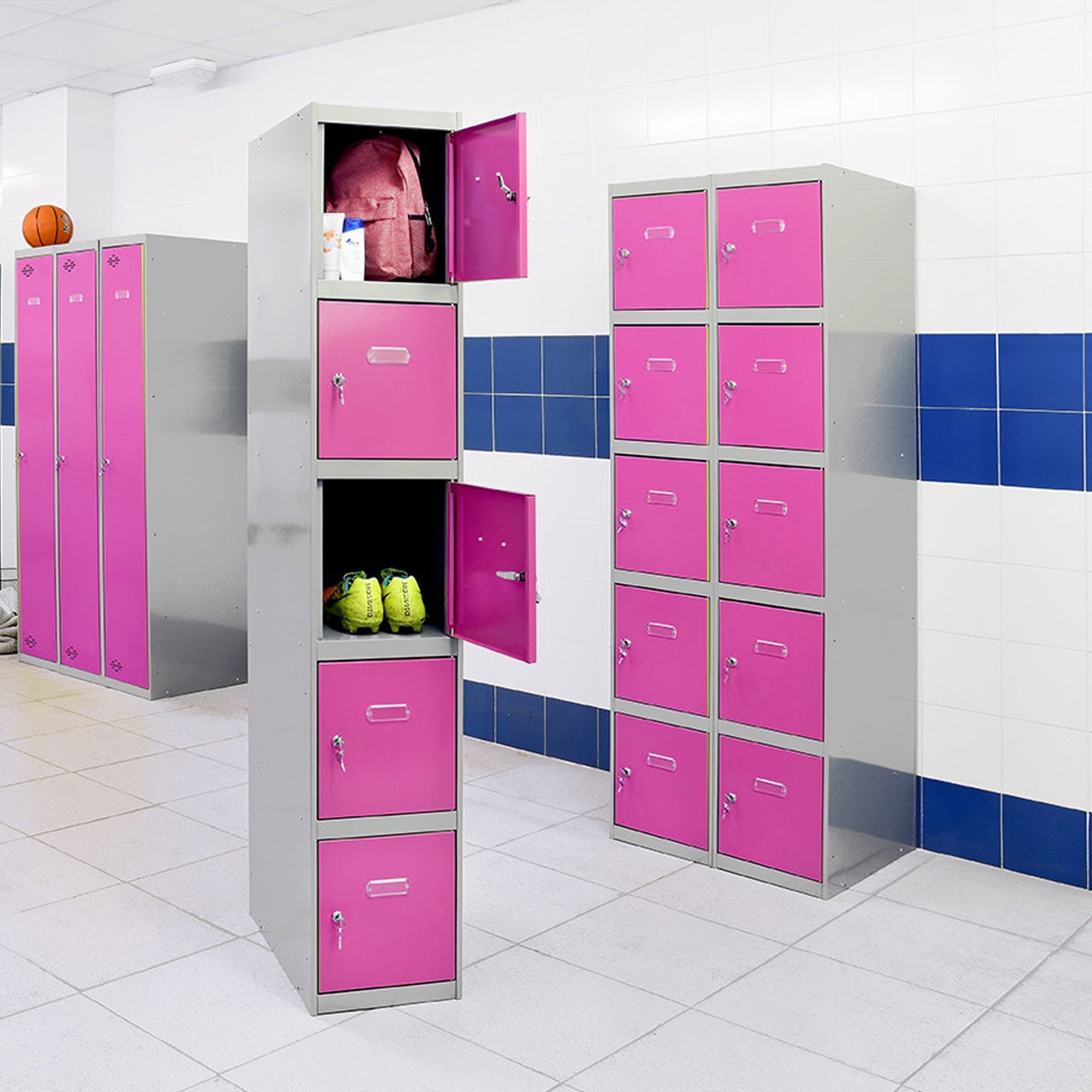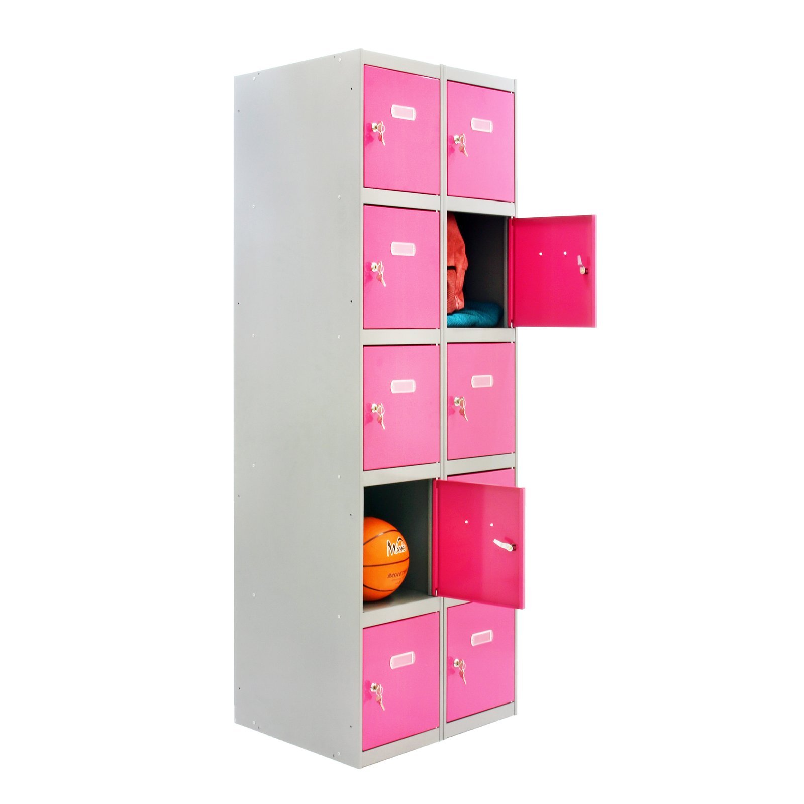 Taquilla metalica de color GRIS/ROSA con medidas, (alto x ancho x largo) 1800x600x500 mm. Se entrega desmontada. Tiene 2 cuerpos y 10 puertas. Incluye cerradura, llaves y etiquetero para colocar nombre. Hecho en Europa, calidad europea