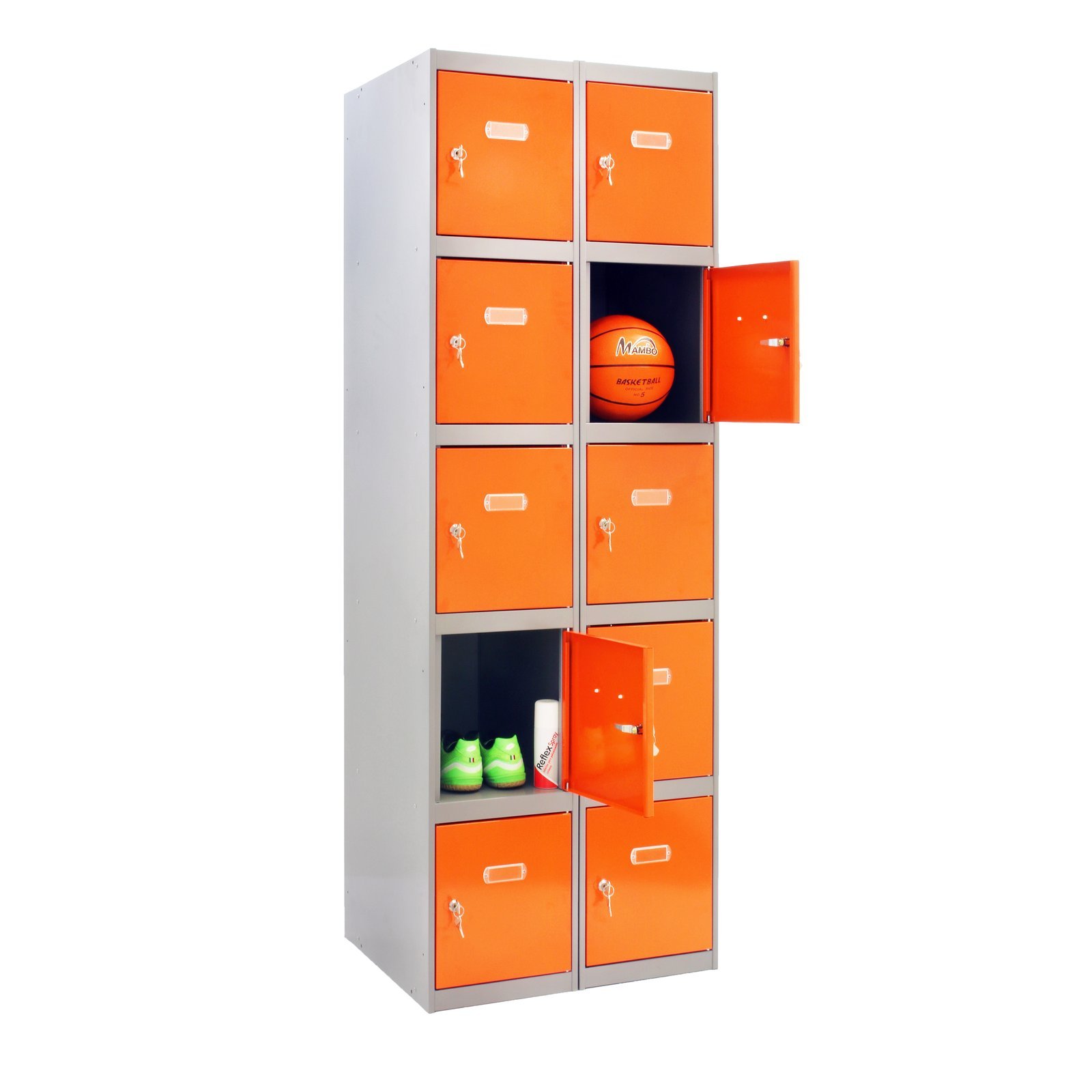 Taquilla metalica personalizada de 2 cuerpos de color gris y 10 puertas de color naranja. Las dimensiones son 1800x800x500 mm. Se entrega desmontada. Modulo inicial. Se monta de forma facil siguiendo las instrucciones. Producto fabricado en Europa por Simonrack. No contiene aristas de corte y no necesita anclaje a la pared