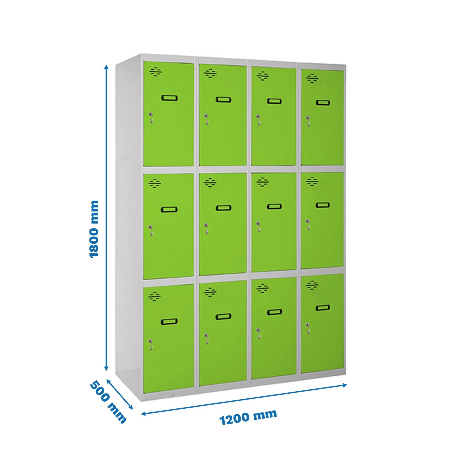 Casillero metalico de 4 cuerpos con 12 puertas de color gris y las puertas verdes. Las dimensiones son 1800x1200x500 mms. Se entrega montado e incluye respiraderos, llaves, cerraduras y etiqueteros para colocar el nombre. Producto fabricado por Simonrack, calidad europea