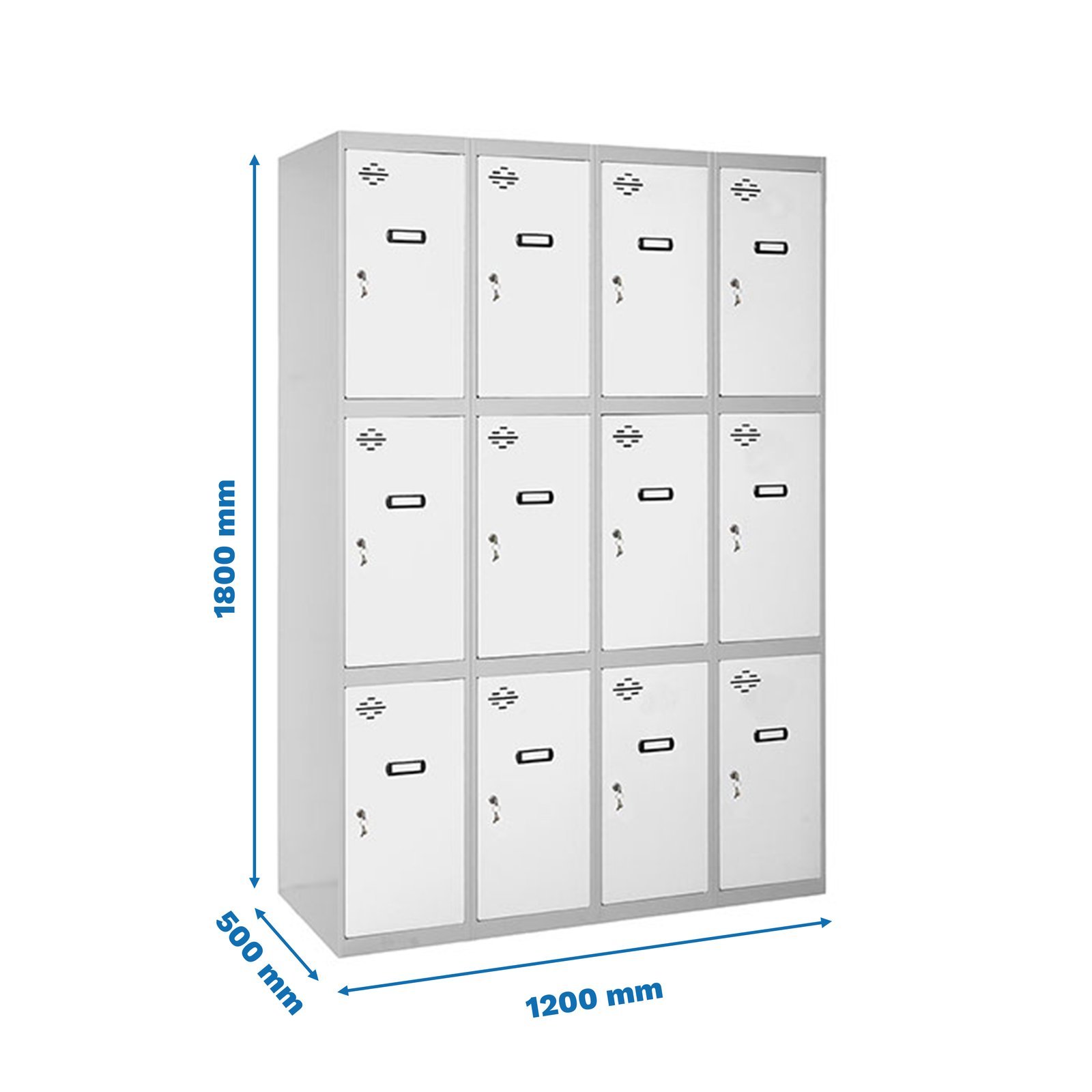 Casillero metalico de 4 cuerpos con 12 puertas de color gris y las puertas blancas. Las dimensiones son 1800x1200x500 mms. Se entrega montado e incluye respiraderos, llaves, cerraduras y etiqueteros para colocar el nombre. Producto fabricado por Simonrack, calidad europea