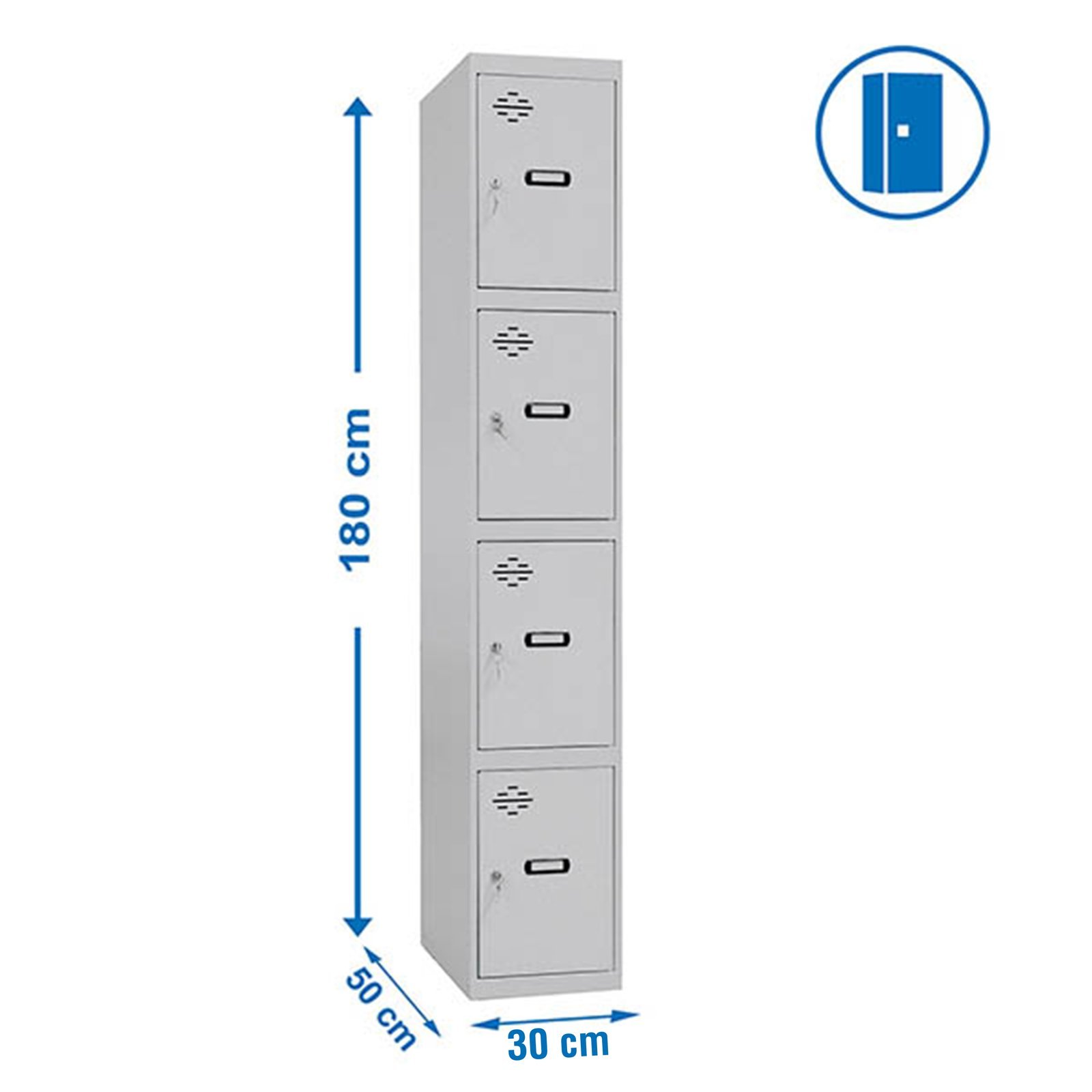 Taquilla metalica de color GRIS/GRIS y medidas (alto x ancho x largo) 1800x300x500 mm. Incluye respiraderos, llaves, cerraduras y etiqueteros para colocar el nombre. Producto fabricado por Simonrack, calidad europea. Medidas en uso del producto, 1803x303x501 mm
