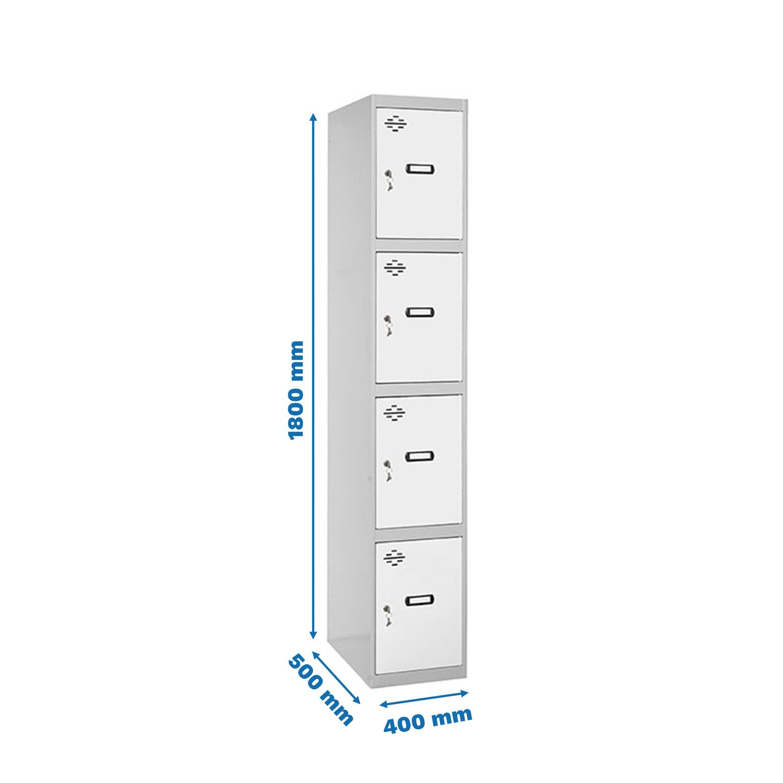 Casillero metalico de 1 cuerpo con 4 puertas de color gris y las puertas blancas. Las dimensiones son 1800x400x500 mms. Se entrega montado e incluye respiraderos, llaves, cerraduras y etiqueteros para colocar el nombre. Producto fabricado por Simonrack, calidad europea