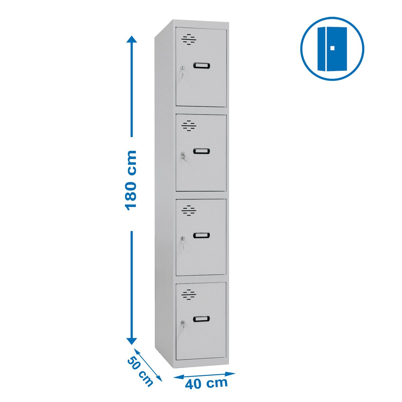Taquilla metalica de color GRIS/GRIS y medidas (alto x ancho x largo) 1800x400x500 mm. Incluye respiraderos, llaves, cerraduras y etiqueteros para colocar el nombre. Producto fabricado por Simonrack, calidad europea. Medidas en uso del producto, 1803x403x501 mm