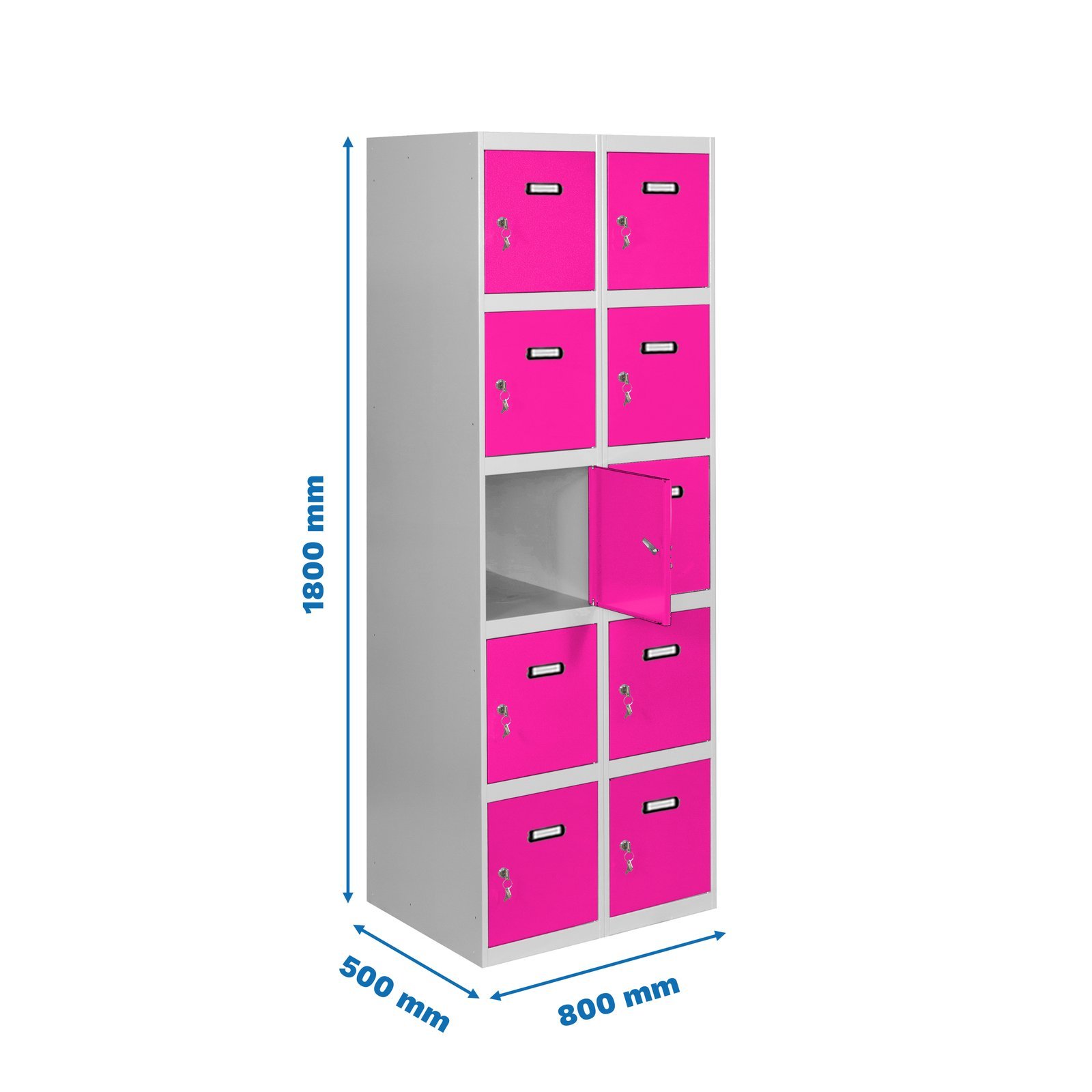 Casillero metalico de 2 cuerpos con 10 puertas de color gris y las puertas rosas. Las dimensiones son 1800x800x500 mms. Se entrega montado e incluye cerraduras, respiraderos y etiqueteros para colocar nombres. Producto fabricado por Simonrack, calidad europea