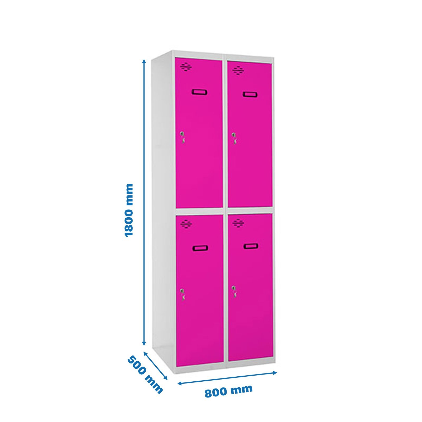 Taquilla metalica de 2 cuerpos con 4 puertas de color gris y las puertas rosas. Las dimensiones son 1800x800x500 mms. Se entrega montado e incluye respiraderos, llaves, cerraduras y etiqueteros para colocar el nombre. Producto fabricado por Simonrack, calidad europea