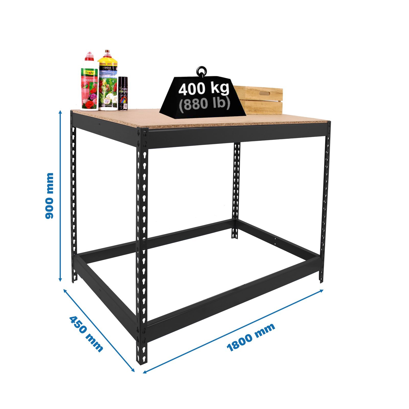 Mesa de trabajo metalica y de montaje sin tornillos de 1 estante y 900x1800x450mms. El estante aguanta 400 kgs, carga certificada a punto de flexion, no de rotura. De color antracita/madera. Producto fabricado en Europa por Simonrack. No contiene aristas de corte y no se tambalea. No necesita anclaje a la pared