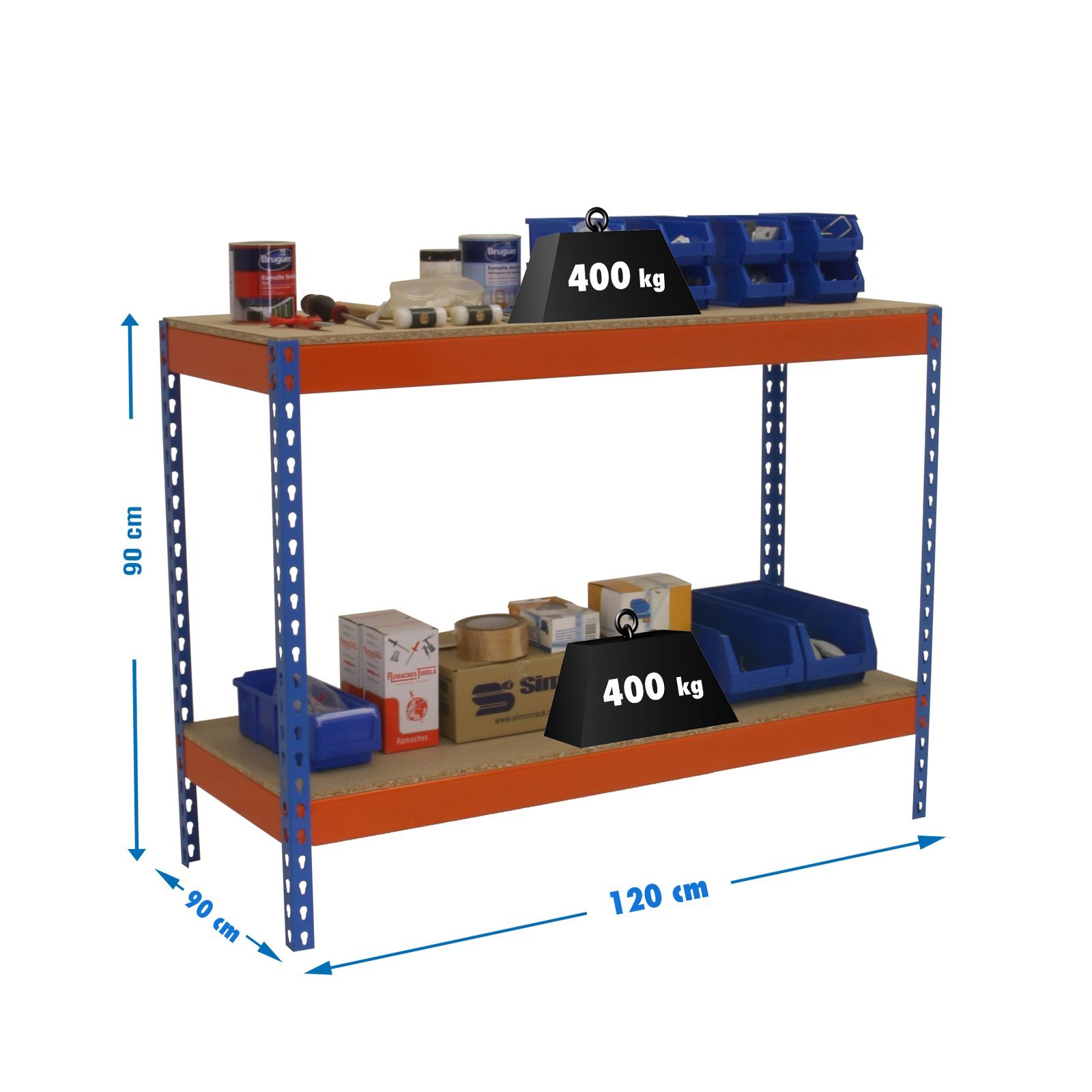 Mesa de trabajo metalica y de montaje sin tornillos con 2 estantes de aglomerado. Cada estante soporta hasta 400 kg. Manipulacion sin riesgo, sin aristas de corte. Mesa ideal para taller o trastero. Producto fabricado en Europa por Simonrack. Medidas en uso del producto, 877x1210x910 mm