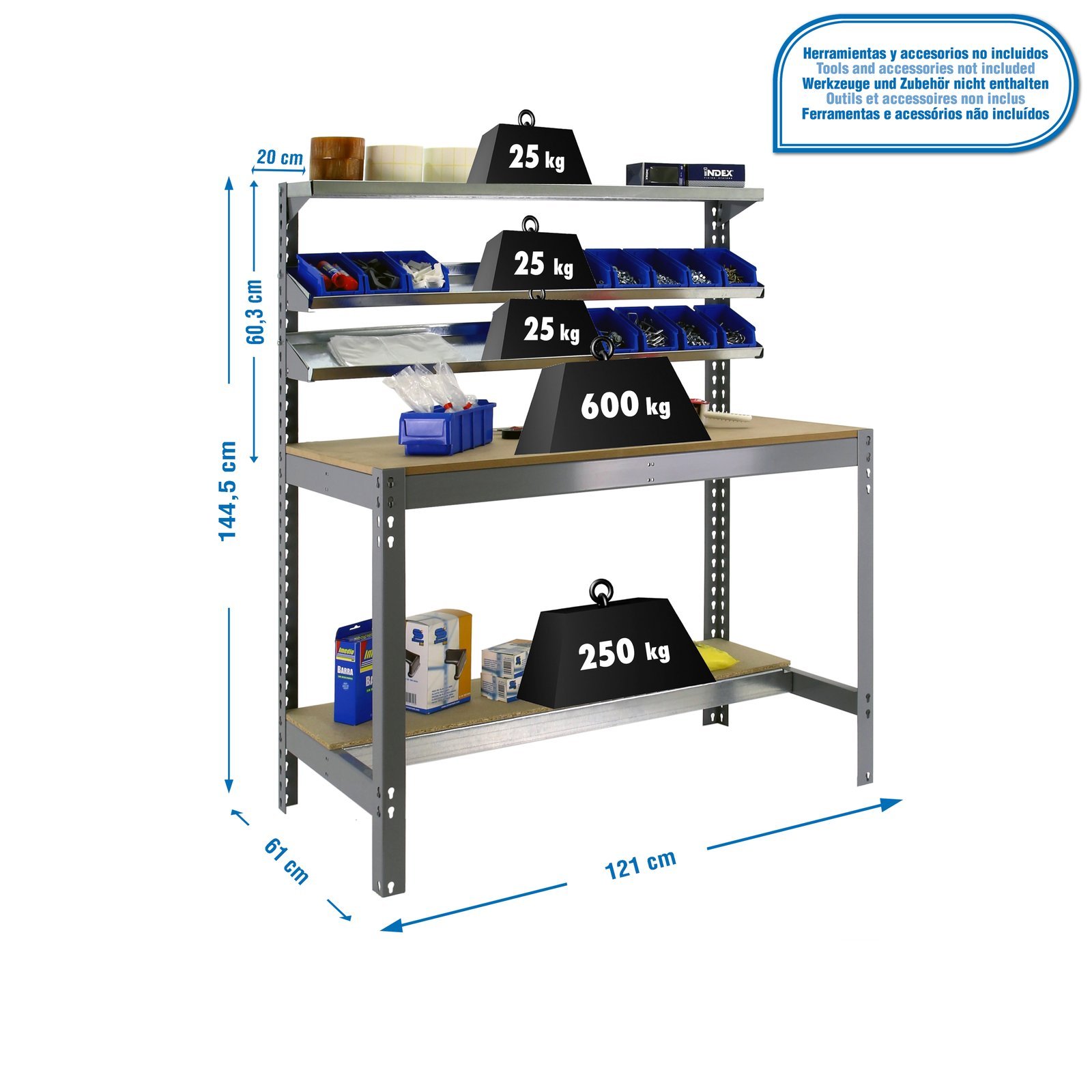 Banco de trabajo metalico de color GRIS/MADERA con capacidad de carga de 600 kg. Las medidas (alto x ancho x fondo) son 1445x1210x610 mm. Contiene 3 repisas superiores para almacenaje de herramientas. Cada repisa superior soporta hasta 25 kg de capacidad de carga. Producto europeo, calidad europea, podras encontrar las instrucciones de montaje en su interior o en este enlace, https, //www. youtube. com/watch?v=JOTQTTYCbDQ. Medidas en uso del producto, 1445x1210x610 mm
