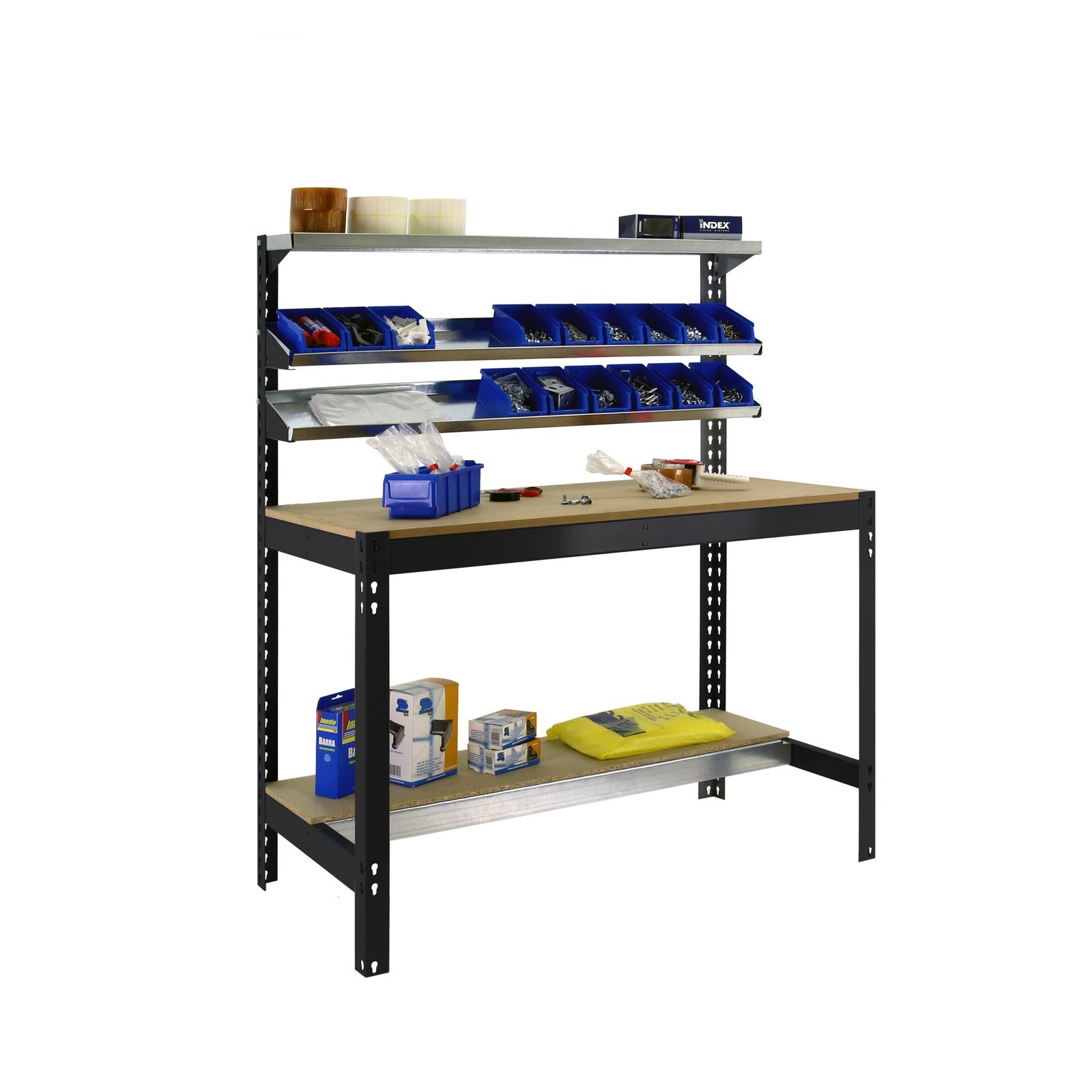 Banco de trabajo metalico de color ANTRACITA/MADERA con capacidad de carga de 400 kg. Contiene 3 repisas superiores para herramientas con capacidad de carga de hasta 25 kg. Las medidas del banco de trabajo (alto x ancho x fondo) son, 1445x910x610 mm. Producto europeo, calidad europea, podras encontrar las instrucciones de montaje en su interior o en este enlace, https, //www. youtube. com/watch?v=JOTQTTYCbDQ. Medidas en uso del producto, 1445x910x610 mm