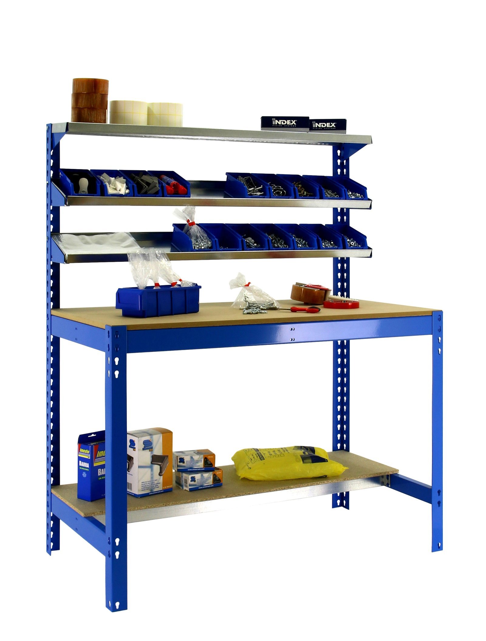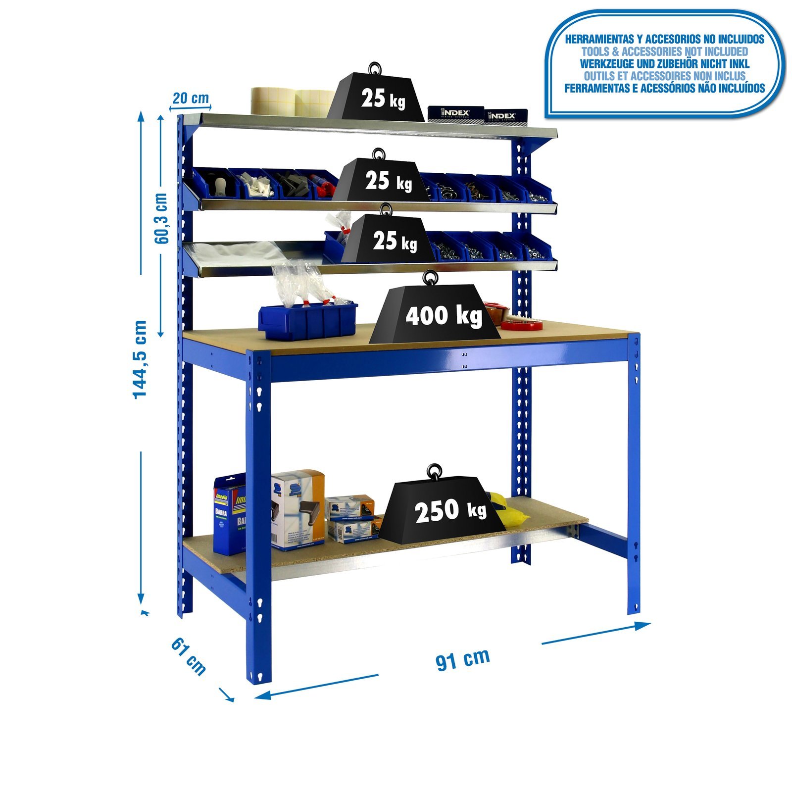 Banco de trabajo metalico de color AZUL/MADERA con capacidad de carga de 400 kg. Las medidas (alto x ancho x fondo) son 1445x910x610 mm. Contiene 3 repisas superiores para almacenaje de herramientas. Cada repisa superior soporta hasta 25 kg de capacidad de carga. Producto europeo, calidad europea, podras encontrar las instrucciones de montaje en su interior o en este enlace, https, //www. youtube. com/watch?v=JOTQTTYCbDQ. Medidas en uso del producto, 1445x910x610 mm