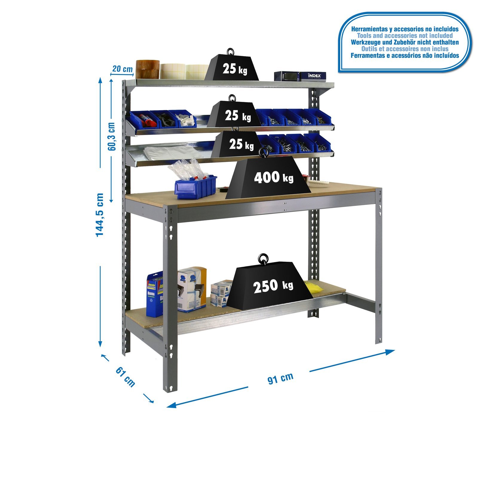 Banco de trabajo metalico de color GRIS/MADERA con capacidad de carga de 400 kg. Las medidas (alto x ancho x fondo) son 1445x910x610 mm. Contiene 3 repisas superiores para almacenaje de herramientas. Cada repisa superior soporta hasta 25 kg de capacidad de carga. Producto europeo, calidad europea, podras encontrar las instrucciones de montaje en su interior o en este enlace, https, //www. youtube. com/watch?v=JOTQTTYCbDQ. Medidas en uso del producto, 1445x910x610 mm