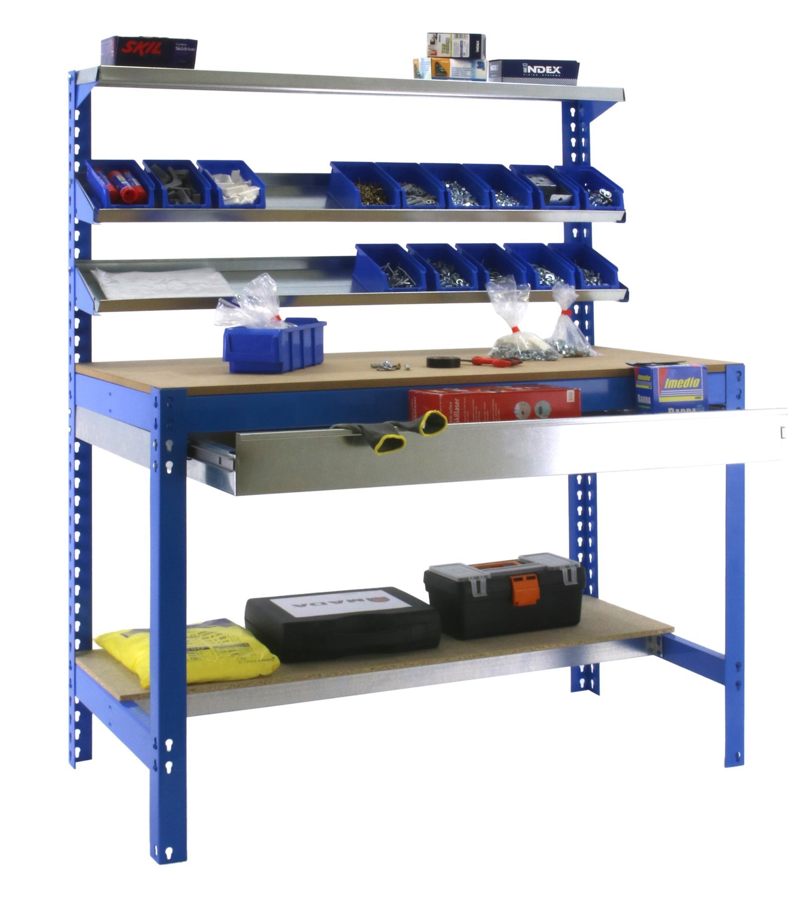 Banco de trabajo metalico de color AZUL/MADERA con capacidad de carga de 400 kg. Las medidas (alto x ancho x fondo) son 1445x910x610 mm. Incluye cajon metalico con capacidad de 35 kg. Contiene 3 repisas superiores para almacenaje de herramientas. Cada repisa superior soporta hasta 25 kg de capacidad de carga. Producto europeo, calidad europea, podras encontrar las instrucciones de montaje en su interior o en este enlace, https, //www. youtube. com/watch?v=9HAARC490MY. Medidas en uso del producto, 1445x910x610 mm
