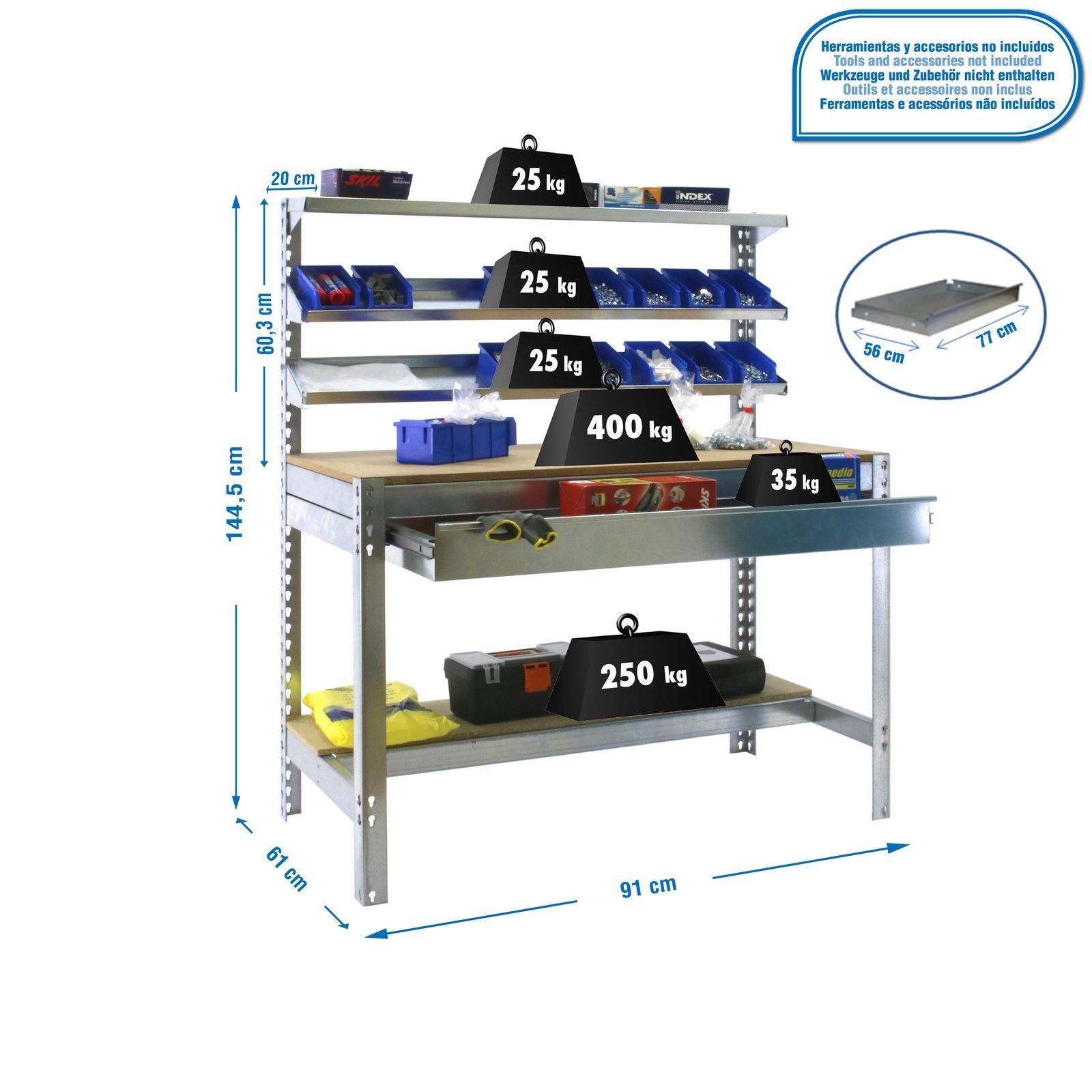 Banco de trabajo metalico de color GALVA/MADERA con capacidad de carga de 400 kg. Las medidas (alto x ancho x fondo) son 1445x910x610 mm. Incluye cajon metalico con capacidad de 35 kg. Contiene 3 repisas superiores para almacenaje de herramientas. Cada repisa superior soporta hasta 25 kg de capacidad de carga. Producto europeo, calidad europea, podras encontrar las instrucciones de montaje en su interior o en este enlace, https, //www. youtube. com/watch?v=9HAARC490MY. Medidas en uso del producto, 1445x910x610 mm