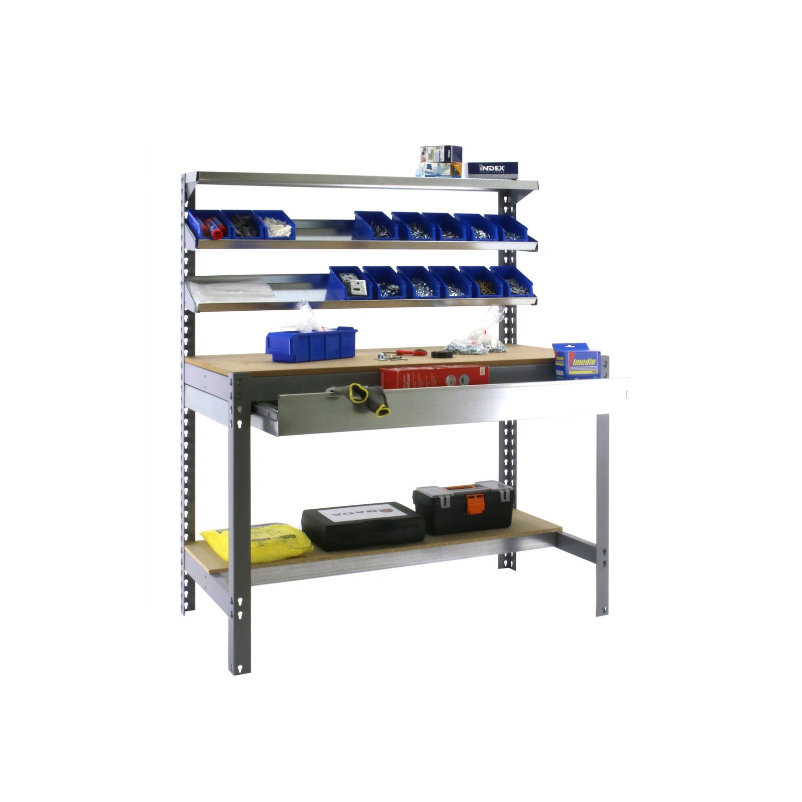 Banco de trabajo metalico de color GRIS/MADERA con capacidad de carga de 400 kg. Las medidas (alto x ancho x fondo) son 1445x910x610 mm. Incluye cajon metalico con capacidad de 35 kg. Contiene 3 repisas superiores para almacenaje de herramientas. Cada repisa superior soporta hasta 25 kg de capacidad de carga. Producto europeo, calidad europea, podras encontrar las instrucciones de montaje en su interior o en este enlace, https, //www. youtube. com/watch?v=9HAARC490MY. Medidas en uso del producto, 1445x910x610 mm