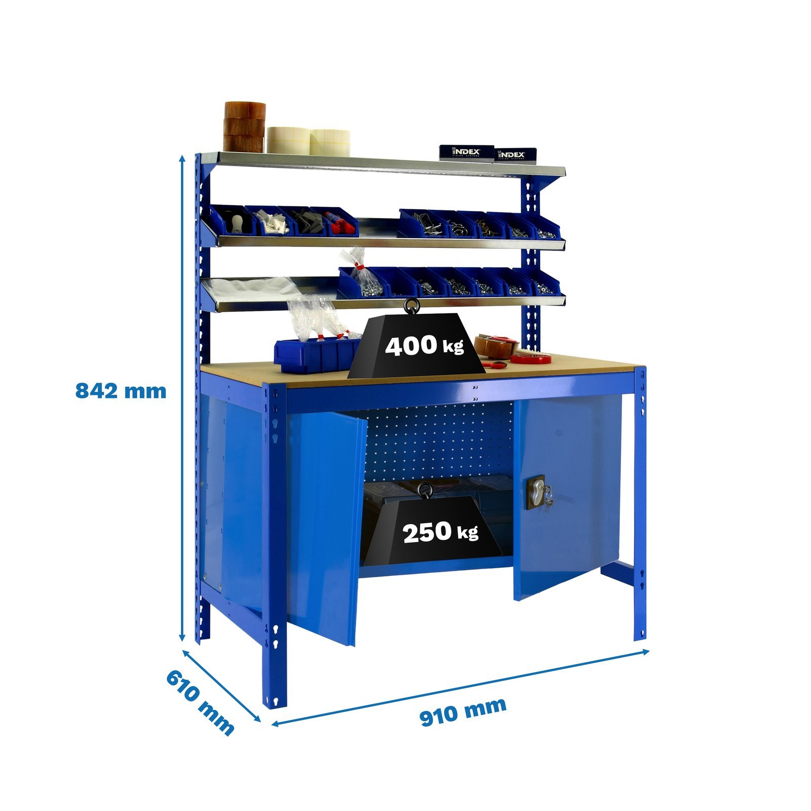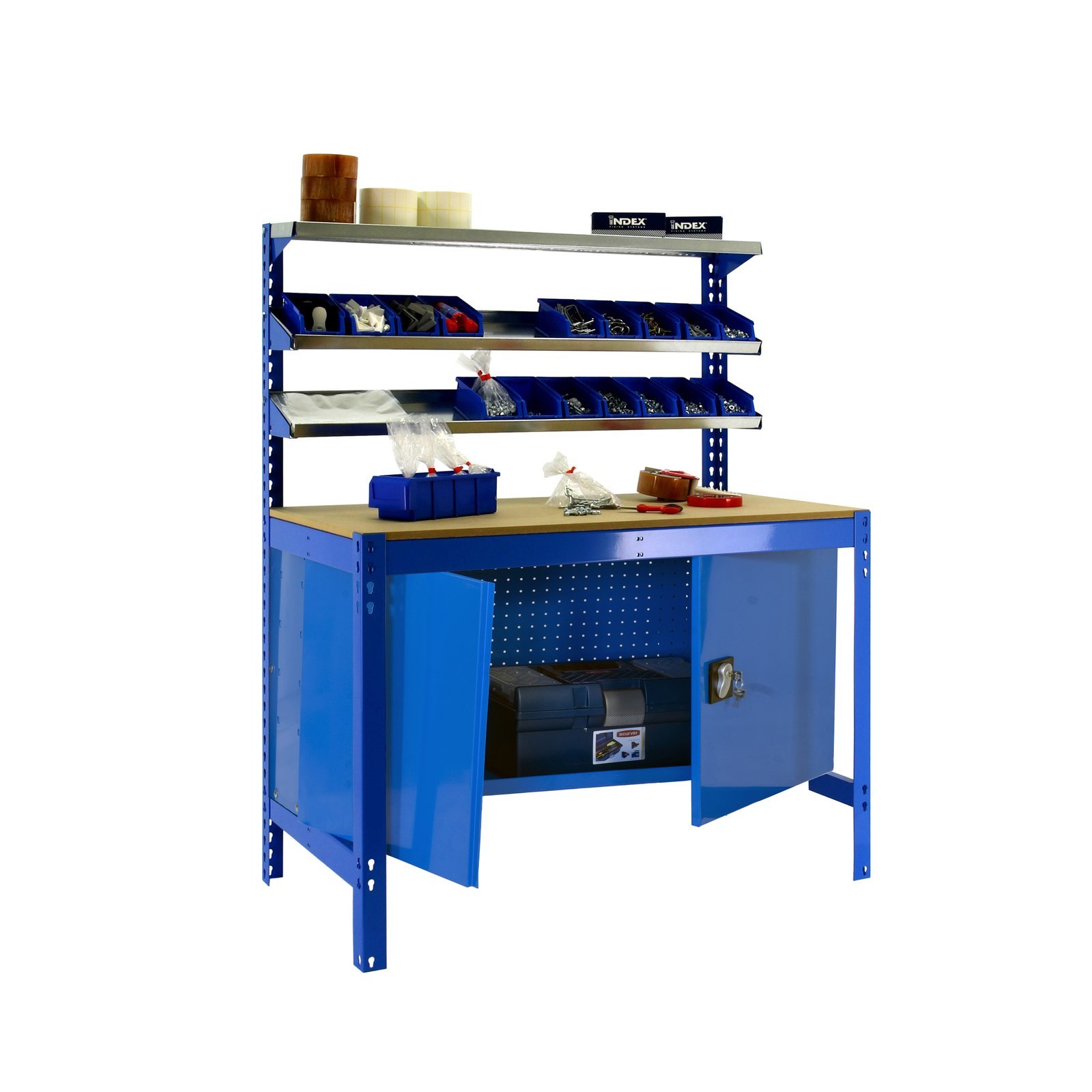 Banco de trabajo metalico con armario para almacenaje de herramientas para incluir en el banco de trabajo BT1 de Simonrack. Color, azul. Capacidad de carga, 75 kg el armario. Dimensiones (alto x ancho x fondo), 842x910x610 mm. Contiene 3 repisas superiores para almacenaje de herramientas. Cada repisa superior soporta hasta 25 kg de capacidad de carga. Producto fabricado en Europa por Simonrack