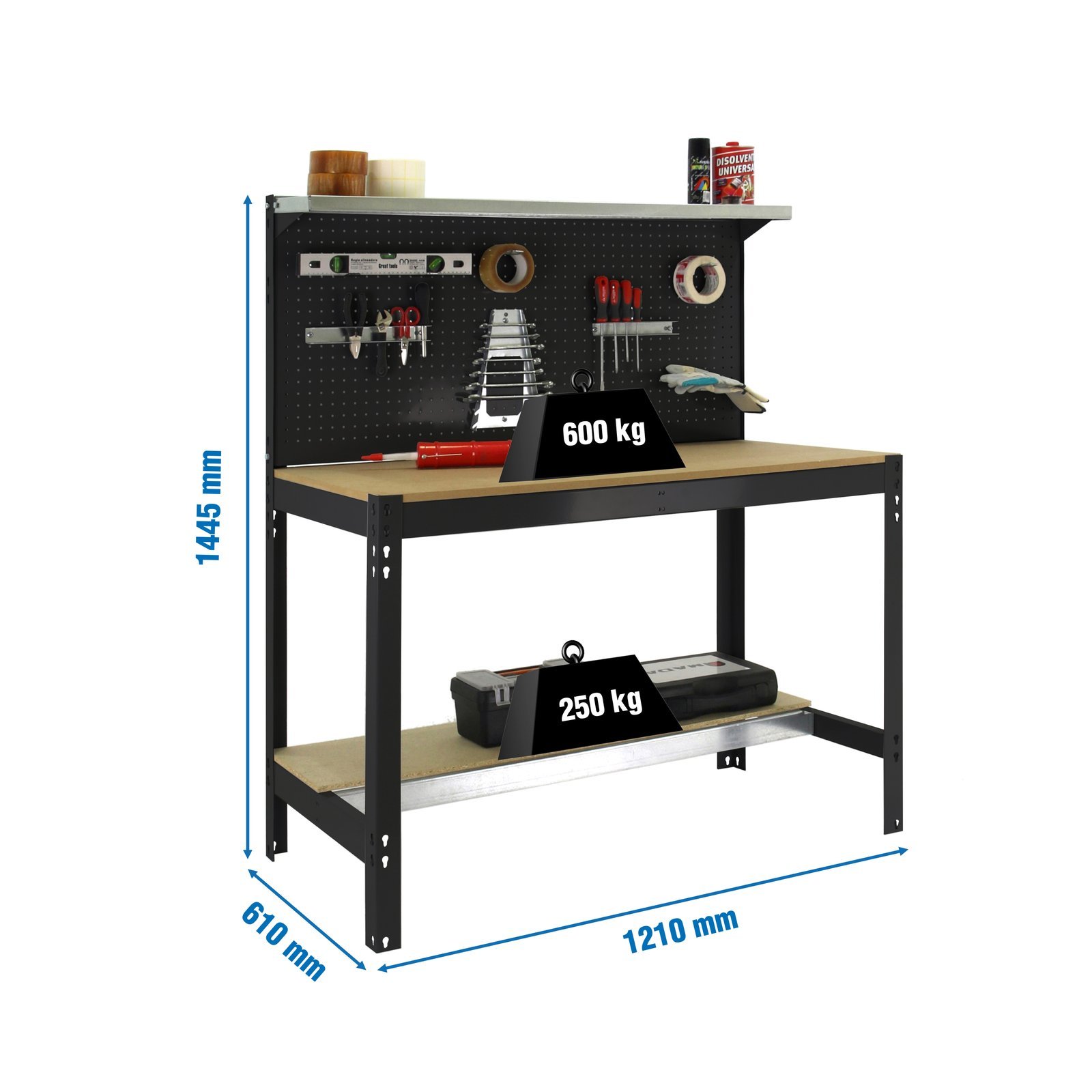Banco de trabajo metalico de color ANTRACITA/MADERA con capacidad de carga de 600 kg. Las medidas (alto x ancho x fondo) son 1445x1210x610 mm. Producto europeo, calidad europea, podras encontrar las instrucciones de montaje en su interior o en este enlace, https, //www. youtube. com/watch?v=4vv38d3Jns0. Medidas en uso del producto, 1445x1210x610 mm