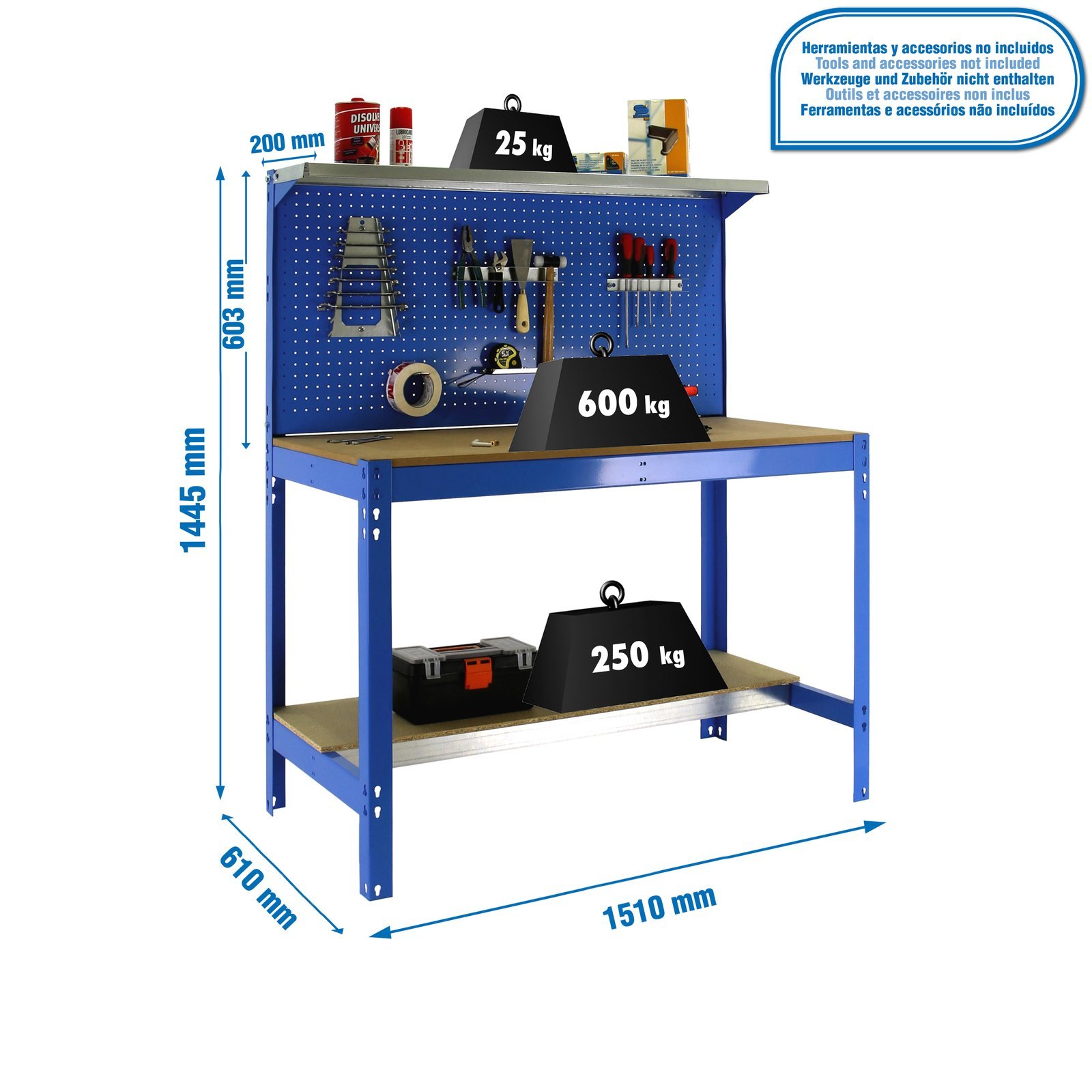 Banco de trabajo metalico de color AZUL/MADERA con capacidad de carga de 600 kg. Las medidas (alto x ancho x fondo) son 1445x1510x610 mm. Producto europeo, calidad europea, podras encontrar las instrucciones de montaje en su interior o en este enlace, https, //www. youtube. com/watch?v=4vv38d3Jns0. Medidas en uso del producto, 1445x1510x610 mm