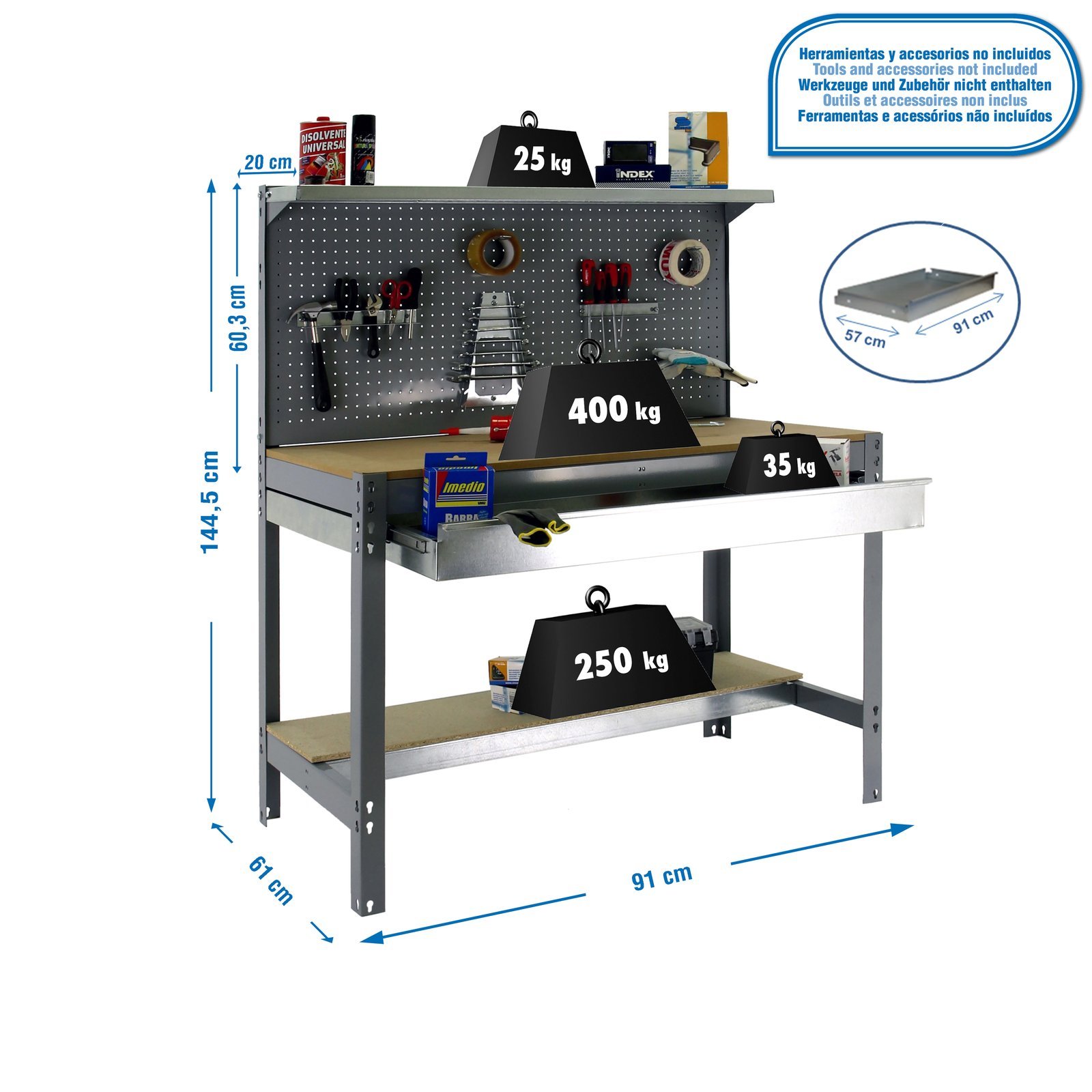 Banco de trabajo metalico de color GRIS/MADERA con capacidad de carga de 400 kg. Las medidas (alto x ancho x fondo) son 1445x910x610 mm. Incluye cajon metalico con capacidad de 35 kg. Producto europeo, calidad europea, podras encontrar las instrucciones de montaje en su interior o en este enlace, https, //www. youtube. com/watch?v=gw-_YZh8bjY. Medidas en uso del producto, 1445x910x610 mm