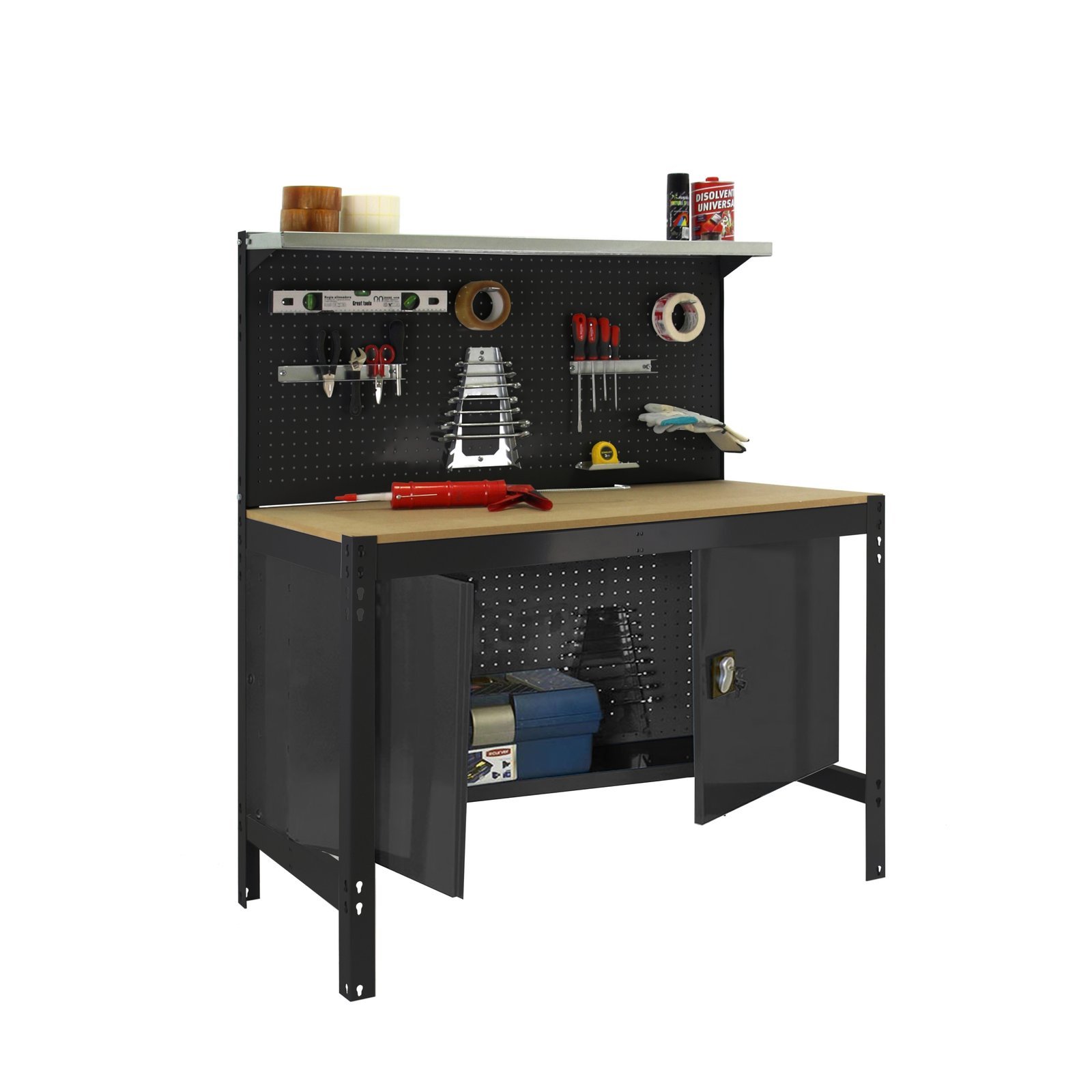 Banco de trabajo metalico de color ANTRACITA/MADERA con capacidad de carga de 600 kg. Las medidas (alto x ancho x fondo) son 1445x1210x610 mm. Contiene armario para almacenaje de herramientas. Producto europeo, calidad europea, podras encontrar las instrucciones de montaje en su interior o en este enlace, https, //www. youtube. com/watch?v=4vv38d3Jns0. Medidas en uso del producto, 1445x1210x610 mm