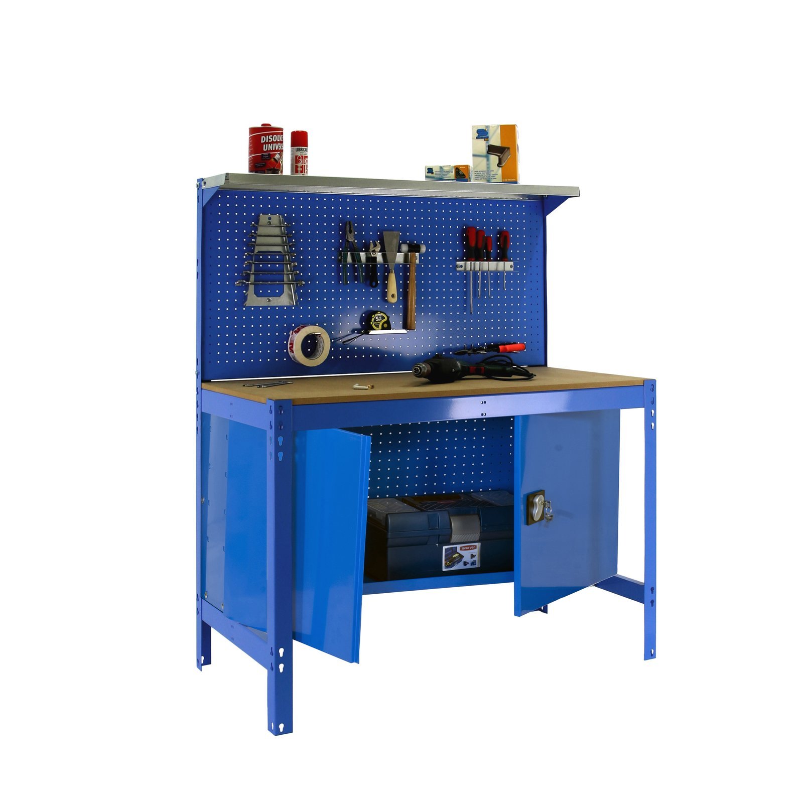 Banco de trabajo metalico de color AZUL/MADERA con capacidad de carga de 600 kg. Las medidas (alto x ancho x fondo) son 1445x1210x610 mm. Producto europeo, calidad europea, podras encontrar las instrucciones de montaje en su interior o en este enlace, https, //www. youtube. com/watch?v=4vv38d3Jns0. Medidas en uso del producto, 1445x1210x610 mm
