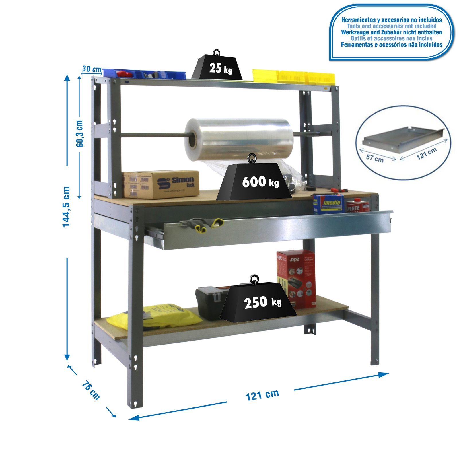 Banco de trabajo sin tornillos con bandejas de madera. Incluye repisa superior (montaje con tornillos), cajon y larguero cuelga rollos. Es de color GRIS/MADERA. Tiene 3 estantes. Las dimensiones de esta estanteria son, 1445x1210x760 mm. Y tiene una capacidad de carga de 600 kgs el estante principal y 250 kgs el estante inferior. La repisa superior aguanta hasta 25 kgs y el cajon 35 kgs. Es fabricado en Europa por Simonrack y se monta rapido siguiendo las instrucciones
