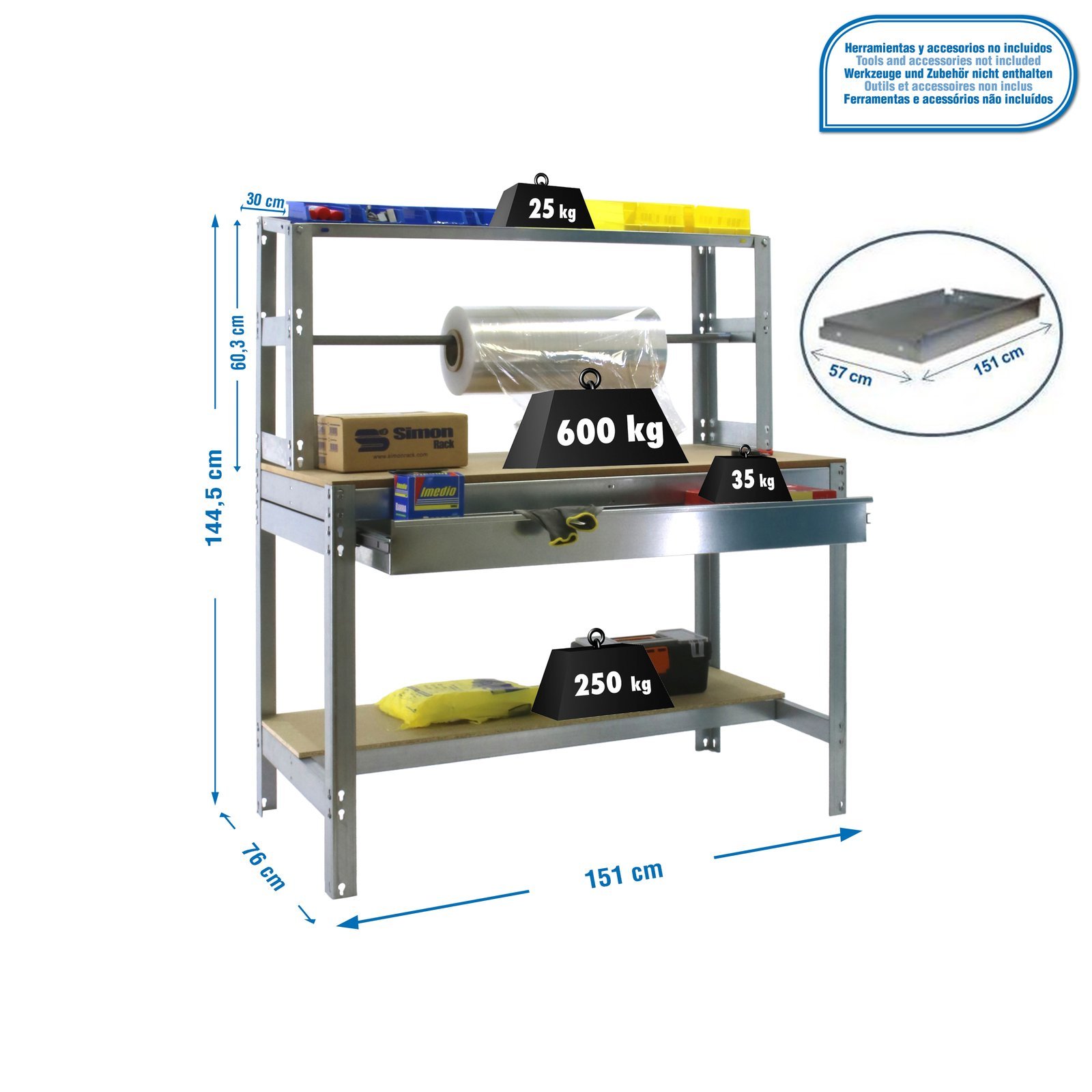 Banco de trabajo sin tornillos con bandejas de madera. Incluye repisa superior (montaje con tornillos), cajon y larguero cuelga rollos. Es de color GALVA/MADERA. Tiene 3 estantes. Las dimensiones de esta estanteria son, 1445x1510x760 mm. Y tiene una capacidad de carga de 600 kgs el estante principal y 250 kgs el estante inferior. La repisa superior aguanta hasta 25 kgs y el cajon 35 kgs. Es fabricado en Europa por Simonrack y se monta rapido siguiendo las instrucciones