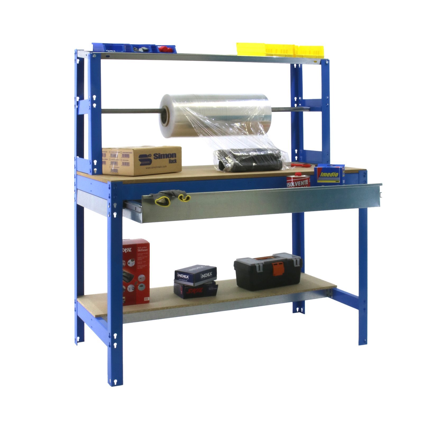 Banco de trabajo sin tornillos con bandejas de madera. Incluye repisa superior (montaje con tornillos), cajon y larguero cuelga rollos. Es de color AZUL/MADERA. Tiene 3 estantes. Las dimensiones de esta estanteria son, 1445x910x760 mm. Y tiene una capacidad de carga de 400 kgs el estante principal y 250 kgs el estante inferior. La repisa superior aguanta hasta 25 kgs y el cajon 35 kgs. Es fabricado en Europa por Simonrack y se monta rapido siguiendo las instrucciones