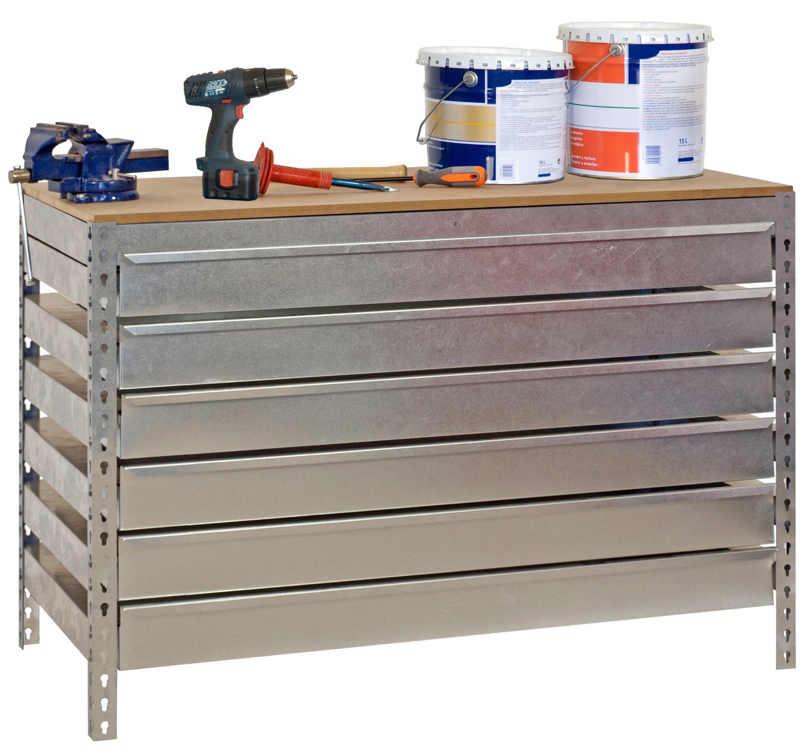 Banco de trabajo sin tornillos con bandeja de madera. Es de color GALVA/MADERA. Tiene 1 estante. Incluye multiples cajones con guias telescopicas. Las dimensiones de esta estanteria son, 842x910x610 mm. Y tiene una capacidad de carga de 600 kgs el estante principal. Los cajones aguantan hasta 35 kgs cada uno. Es fabricado en Europa por Simonrack y se monta rapido siguiendo las instrucciones