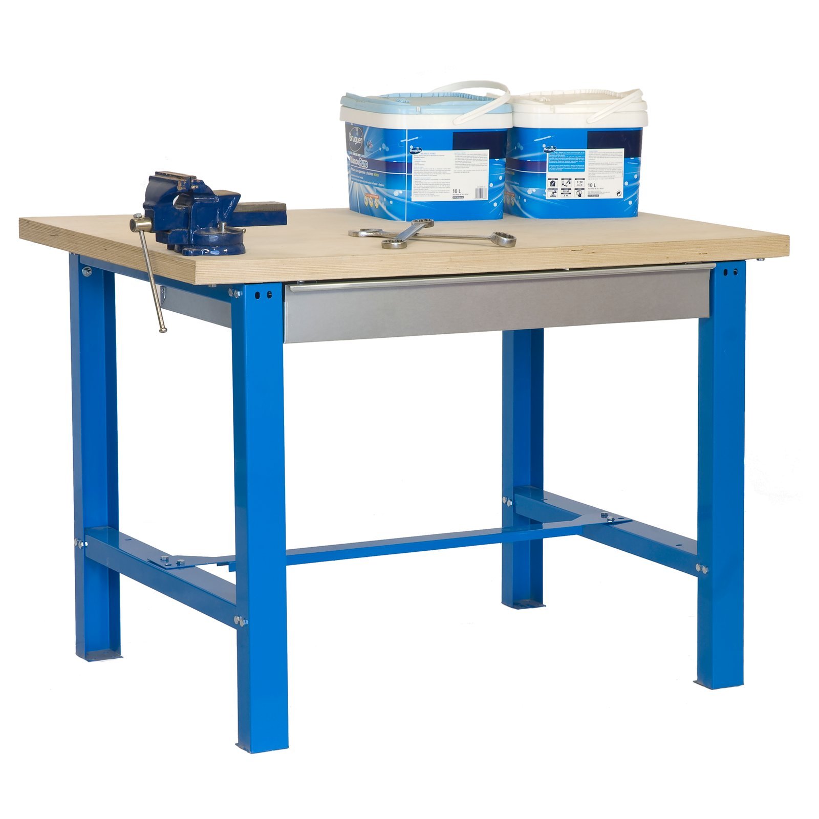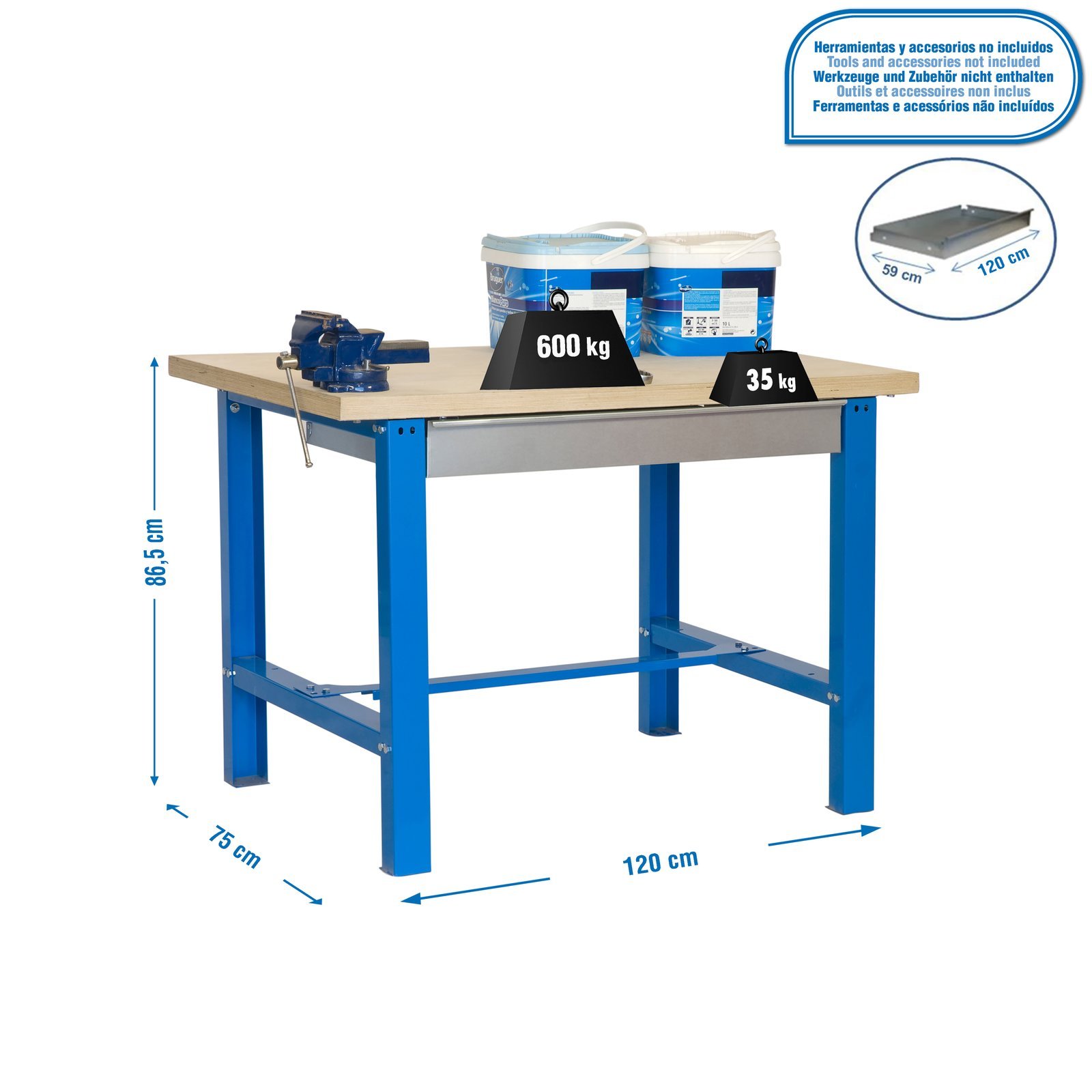 Banco de trabajo con tornillos y bandeja de MDF 35 mm. Incluye cajon. Es de color AZUL/MDF. Las dimensiones de este banco de trabajo son, 865x1200x750 mm. Y tiene una capacidad de carga de 600 kgs el estante. El cajon aguanta hasta 35 kgs y cuenta con guias telescopicas para una mayor facilidad de uso. Esta fabricado en Europa por Simonrack y se monta facil siguiendo las instrucciones