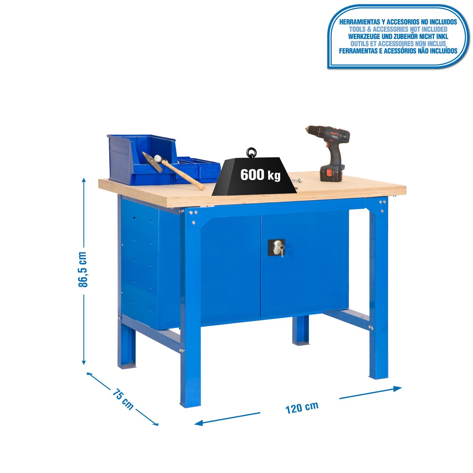 Banco de trabajo con tornillos y bandeja de MDF 35 mm. Incluye armario con cerradura para guardar herramientas. Es de color AZUL/MDF. Las dimensiones de este banco de trabajo son, 865x1200x750 mm. Y tiene una capacidad de carga de 600 kgs el estante. El armario aguanta hasta 50 kgs. Esta fabricado en Europa por Simonrack y se monta facil siguiendo las instrucciones