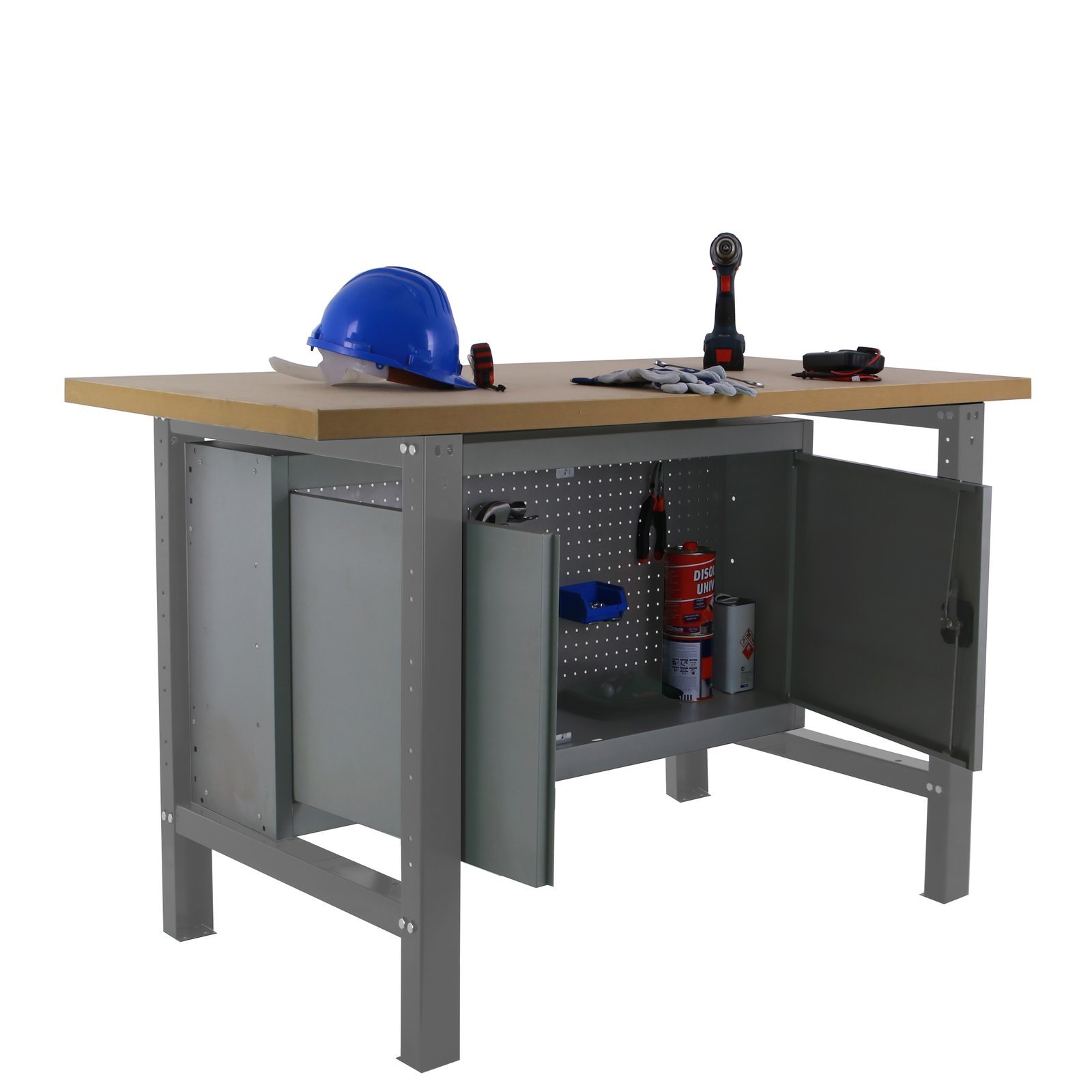 Banco de trabajo con tornillos y bandeja de MDF 35 mm. Incluye armario con cerradura para guardar herramientas. Es de color GRIS/MDF. Las dimensiones de este banco de trabajo son, 865x1500x750 mm. Y tiene una capacidad de carga de 600 kgs el estante. El armario aguanta hasta 50 kgs. Esta fabricado en Europa por Simonrack y se monta facil siguiendo las instrucciones