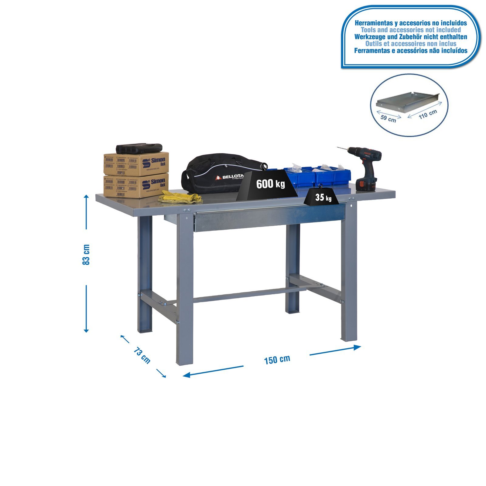 Banco de trabajo con tornillos y bandeja metalica. Incluye cajon para guardar herramientas. Es de color GRIS. Las dimensiones de este banco de trabajo son, 830x1500x730 mm. Y tiene una capacidad de carga de 600 kgs. El cajon aguanta hasta 35 kgs y cuenta con guias telescopicas para una mayor facilidad de uso. Esta fabricado en Europa por Simonrack y se monta facil siguiendo las instrucciones