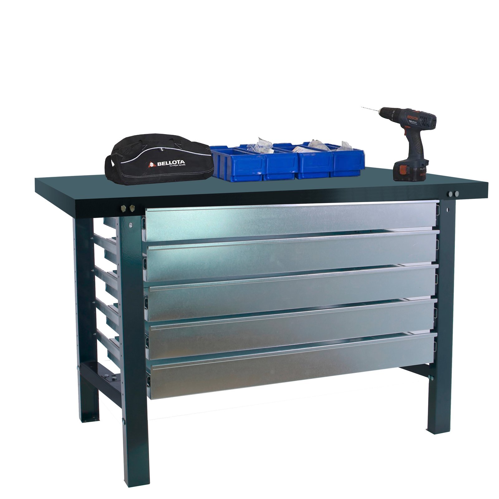 Banco de trabajo con tornillos y bandeja metalica. Incluye 5 cajones para guardar y almacenar las herrmientas. Es de color ANTRACITA. Las dimensiones de este banco de trabajo son, 830x1200x730 mm. Y tiene una capacidad de carga de 600 kgs. El cajon aguanta hasta 35 kgs y cuenta con guias telescopicas para una mayor facilidad de uso. Esta fabricado en Europa por Simonrack y se monta facil siguiendo las instrucciones